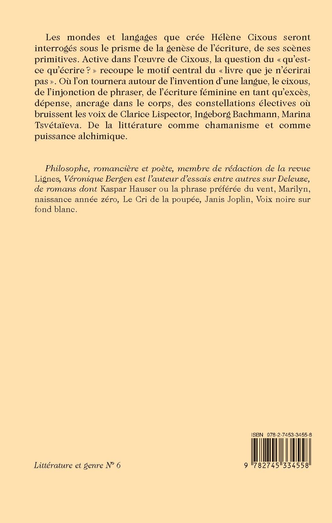 Les mondes et langages que crée Hélène Cixous seront interrogés sous le prisme de la genèse de l’écriture, de ses scènes primitives. Active dans l’oeuvre de Cixous, la question du « qu’estce qu’écrire ? » recoupe le motif central du « livre que je n’écrirai pas ». Où l’on tournera autour de l’invention d’une langue, le cixous, de l’injonction de phraser, de l’écriture féminine en tant qu’excès, dépense, ancrage dans le corps, des constellations électives où bruissent les voix de Clarice Lispector, Ingeborg Bachmann, Marina Tsvétaïeva. De la littérature comme chamanisme et comme puissance alchimique.