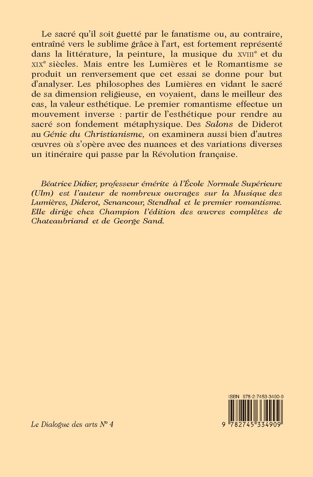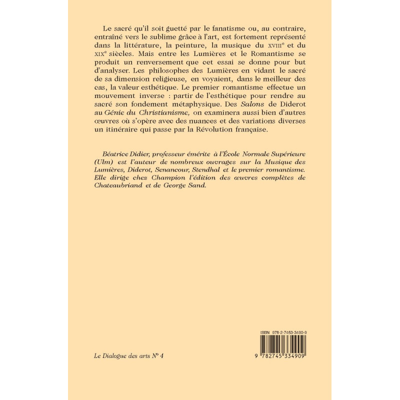 Le sacré qu’il soit guetté par le fanatisme ou, au contraire, entraîné vers le sublime grâce à l’art, est fortement représenté dans la littérature, la peinture, la musique du XVIIIe et du XIXe siècles. Mais entre les Lumières et le Romantisme se produit un renversement que cet essai se donne pour but d’analyser. Les philosophes des Lumières en vidant le sacré de sa dimension religieuse, en voyaient, dans le meilleur des cas, la valeur esthétique. Le premier romantisme effectue un mouvement inverse : partir de l’esthétique pour rendre au sacré son fondement métaphysique. Des Salons de Diderot au Génie du Christianisme, on examinera aussi bien d’autres œuvres où s’opère avec des nuances et des variations diverses un itinéraire qui passe par la Révolution française.