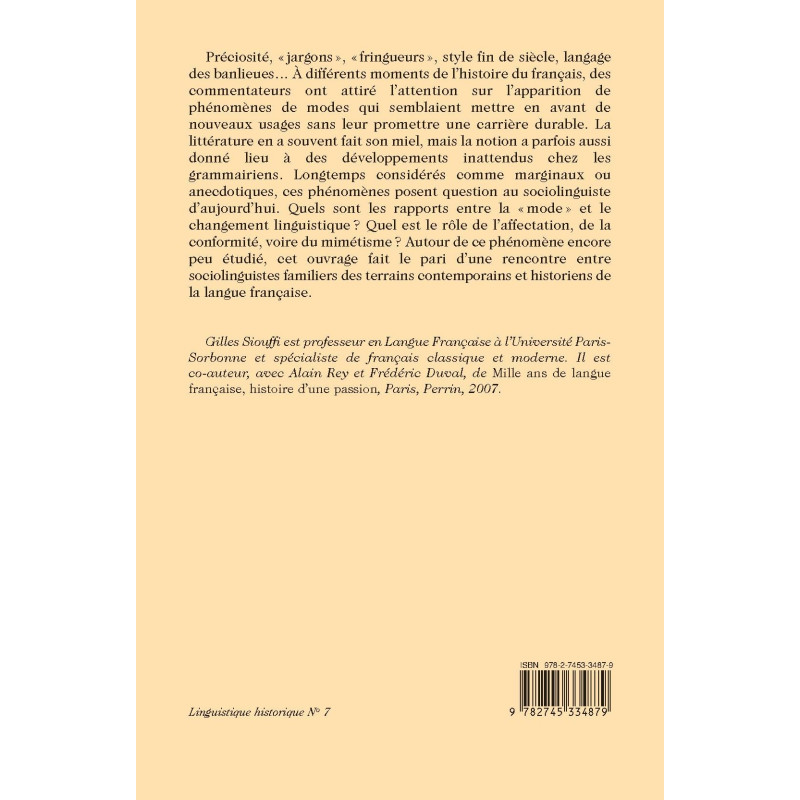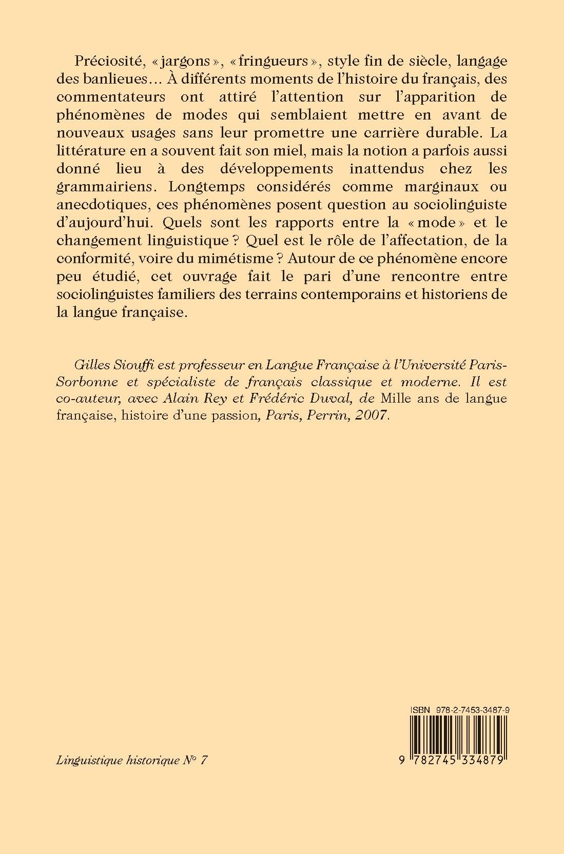 Préciosité, « jargons », « fringueurs », style fin de siècle, langage des banlieues… À différents moments de l’histoire du français, des commentateurs ont attiré l’attention sur l’apparition de phénomènes de modes qui semblaient mettre en avant de nouveaux usages sans leur promettre une carrière durable. La littérature en a souvent fait son miel, mais la notion a parfois aussi donné lieu à des développements inattendus chez les grammairiens. Longtemps considérés comme marginaux ou anecdotiques, ces phénomènes posent question au sociolinguiste d’aujourd’hui. Quels sont les rapports entre la « mode » et le changement linguistique ? Quel est le rôle de l’affectation, de la conformité, voire du mimétisme ? Autour de ce phénomène encore peu étudié, cet ouvrage fait le pari d’une rencontre entre sociolinguistes familiers des terrains contemporains et historiens de la langue française.