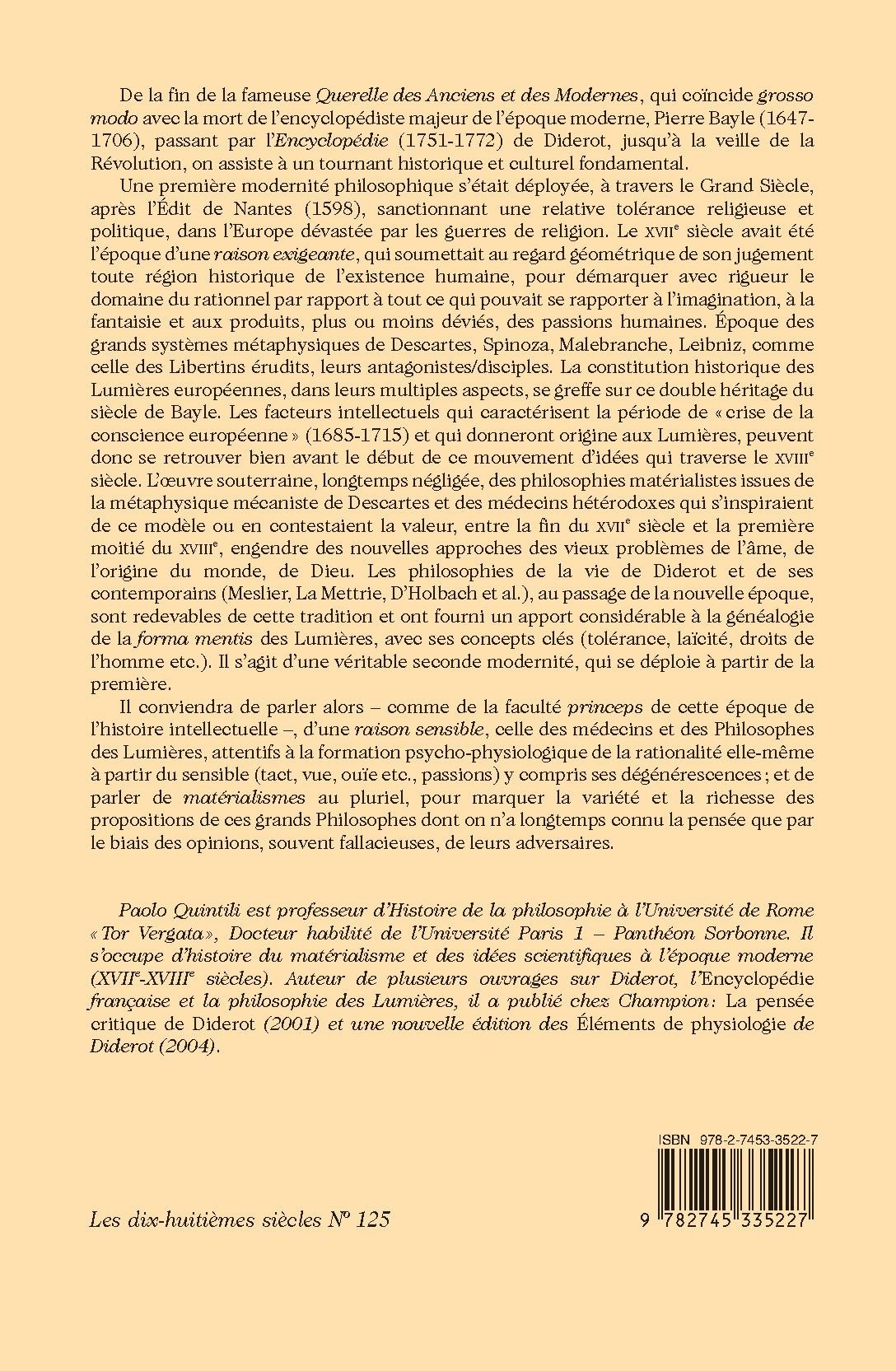 Une première modernité philosophique s’était déployée, à travers le Grand Siècle, après l’Édit de Nantes (1598), sanctionnant une relative tolérance religieuse et politique, dans l’Europe dévastée par les guerres de religion. Le XVIIe siècle avait été l’époque d’une raison exigeante, qui soumettait au regard géométrique de son jugement toute région historique de l’existence humaine, pour démarquer avec rigueur le domaine du rationnel par rapport à tout ce qui pouvait se rapporter à l’imagination, à la fantaisie et aux produits, plus ou moins déviés, des passions humaines. Époque des grands systèmes métaphysiques de Descartes, Spinoza, Malebranche, Leibniz, comme celle des Libertins érudits, leurs antagonistes/disciples. La constitution historique des Lumières européennes, dans leurs multiples aspects, se greffe sur ce double héritage du siècle de Bayle. Les facteurs intellectuels qui caractérisent la période de «crise de la conscience européenne» (1685-1715) et qui donneront origine aux Lumières, peuvent donc se retrouver bien avant le début de ce mouvement d’idées qui traverse le XVIIIe siècle. L’œuvre souterraine, longtemps négligée, des philosophies matérialistes issues de la métaphysique mécaniste de Descartes et des médecins hétérodoxes qui s’inspiraient de ce modèle ou en contestaient la valeur, entre la fin du XVIIe siècle et la première moitié du XVIIIe, engendre des nouvelles approches des vieux problèmes de l’âme, de l’origine du monde, de Dieu. Les philosophies de la vie de Diderot et de ses contemporains (Meslier, La Mettrie, D’Holbach et al.), au passage de la nouvelle époque, sont redevables de cette tradition et ont fourni un apport considérable à la généalogie de la forma mentis des Lumières, avec ses concepts clés (tolérance, laïcité, droits de l’homme etc.). Il s’agit d’une véritable seconde modernité, qui se déploie à partir de la première.
