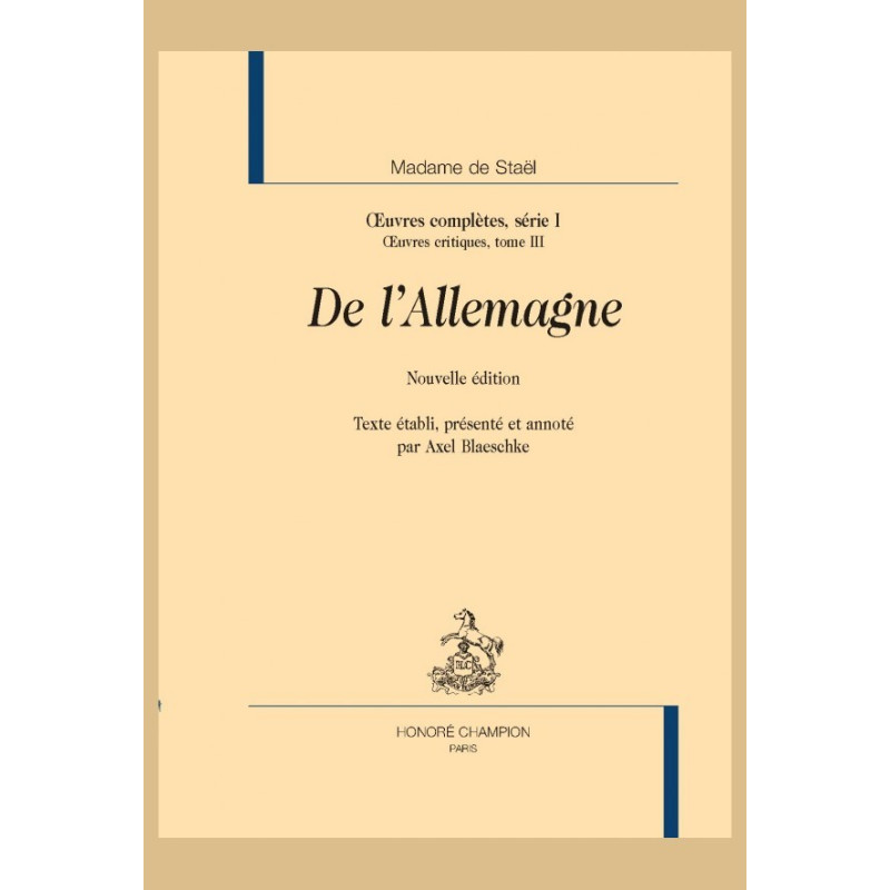 De l’Allemagne procède de deux voyages successifs que Mme de Staël a accomplis outre-Rhin entre 1803 et 1808. Vaste panorama embrassant quantité de réalités géographiques, anthropologiques, culturelles et religieuses de ce pays. Par ailleurs, l’ouvrage est aussi, et peut-être avant tout, un réquisitoire contre la France impériale, sans que le nom de Napoléon apparaisse à aucun moment. L’ouvrage est un traité culturel qui ne cache pas les divers antagonismes existants entre l’Allemagne et la France. De plus, la fameuse distinction entre poésie classique et poésie romantique qu’on lui doit en fait le point de départ de la « bataille romantique ». Initialement document littéraire et culturel, il devient, à partir des années 30 du XIXe siècle, le foyer des controverses politiques qui gagnent les relations franco-allemandes au fil des vicissitudes de leur histoire conflictuelle. Ainsi a pris naissance le mythe des « deux Allemagnes », qui a perduré jusqu’à la Seconde Guerre mondiale pour prendre par la suite un sens différent rendant compte de la réalité de deux États allemands. Rendre justice à l’ouvrage en lui restituant sa complexité, c’est ce que cette nouvelle édition se propose de faire.