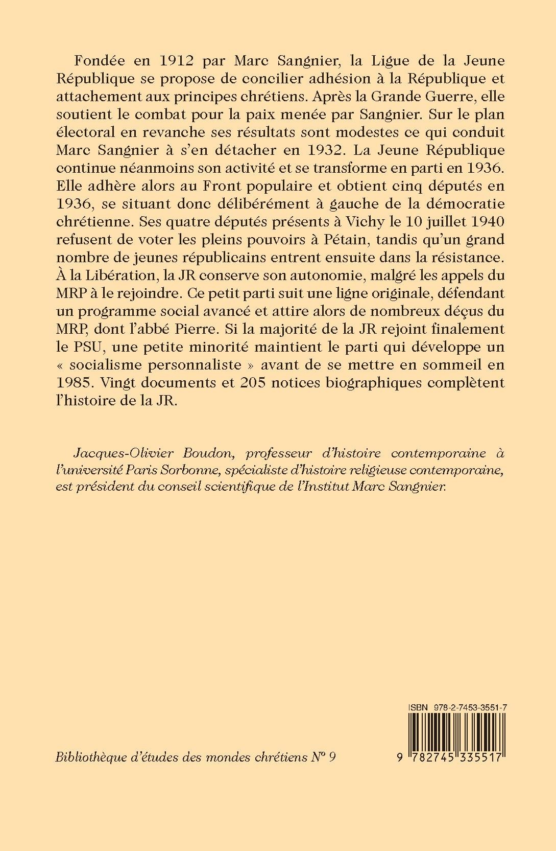 Fondée en 1912 par Marc Sangnier, la Ligue de la Jeune République se propose de concilier adhésion à la République et attachement aux principes chrétiens. Après la Grande Guerre, elle soutient le combat pour la paix menée par Sangnier. Sur le plan électoral en revanche ses résultats sont modestes ce qui conduit Marc Sangnier à s’en détacher en 1932. La Jeune République continue néanmoins son activité et se transforme en parti en 1936. Elle adhère alors au Front populaire et obtient cinq députés en 1936, se situant donc délibérément à gauche de la démocratie chrétienne. Ses quatre députés présents à Vichy le 10 juillet 1940 refusent de voter les pleins pouvoirs à Pétain, tandis qu’un grand nombre de jeunes républicains entrent ensuite dans la résistance. À la Libération, la JR conserve son autonomie, malgré les appels du MRP à le rejoindre. Ce petit parti suit une ligne originale, défendant un programme social avancé et attire alors de nombreux déçus du MRP, dont l’abbé Pierre. Si la majorité de la JR rejoint finalement le PSU, une petite minorité maintient le parti qui développe un « socialisme personnaliste » avant de se mettre en sommeil en 1985. Vingt documents et 205 notices biographiques complètent l’histoire de la JR.