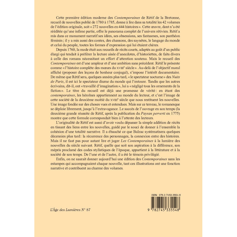 This is the first modern edition of Les Contemporaines. It includes all the short stories from the first edition (1780-1785) as well as the attendant engravings. The collection contains all of Rétif’s ideas, obsessions, fantasies and female Pantheon, as well as the language of the world and of the people.