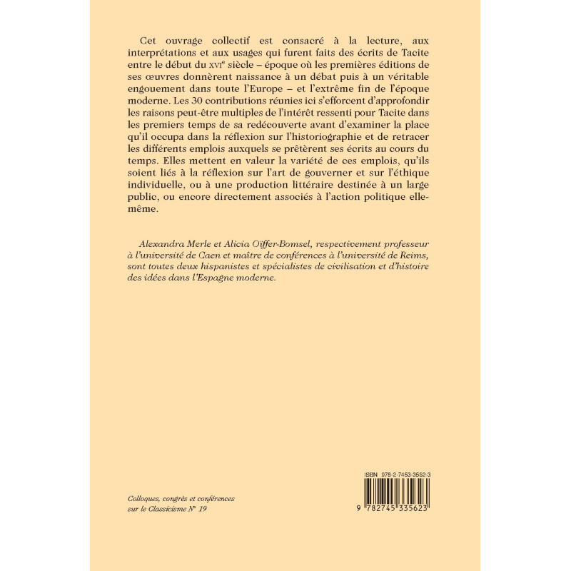 Cet ouvrage collectif est consacré à la lecture, aux interprétations et aux usages qui furent faits des écrits de Tacite entre le début du XVIe siècle – époque où les premières éditions de ses œuvres donnèrent naissance à un débat puis à un véritable engouement dans toute l’Europe – et l’extrême fin de l’époque moderne. Les 30 contributions réunies ici s’efforcent d’approfondir les raisons peut-être multiples de l’intérêt ressenti pour Tacite dans les premiers temps de sa redécouverte avant d’examiner la place qu’il occupa dans la réflexion sur l’historiographie et de retracer les différents emplois auxquels se prêtèrent ses écrits au cours du temps. Elles mettent en valeur la variété de ces emplois, qu’ils soient liés à la réflexion sur l’art de gouverner et sur l’éthique individuelle, ou à une production littéraire destinée à un large public, ou encore directement associés à l’action politique elle-même.