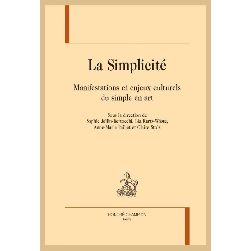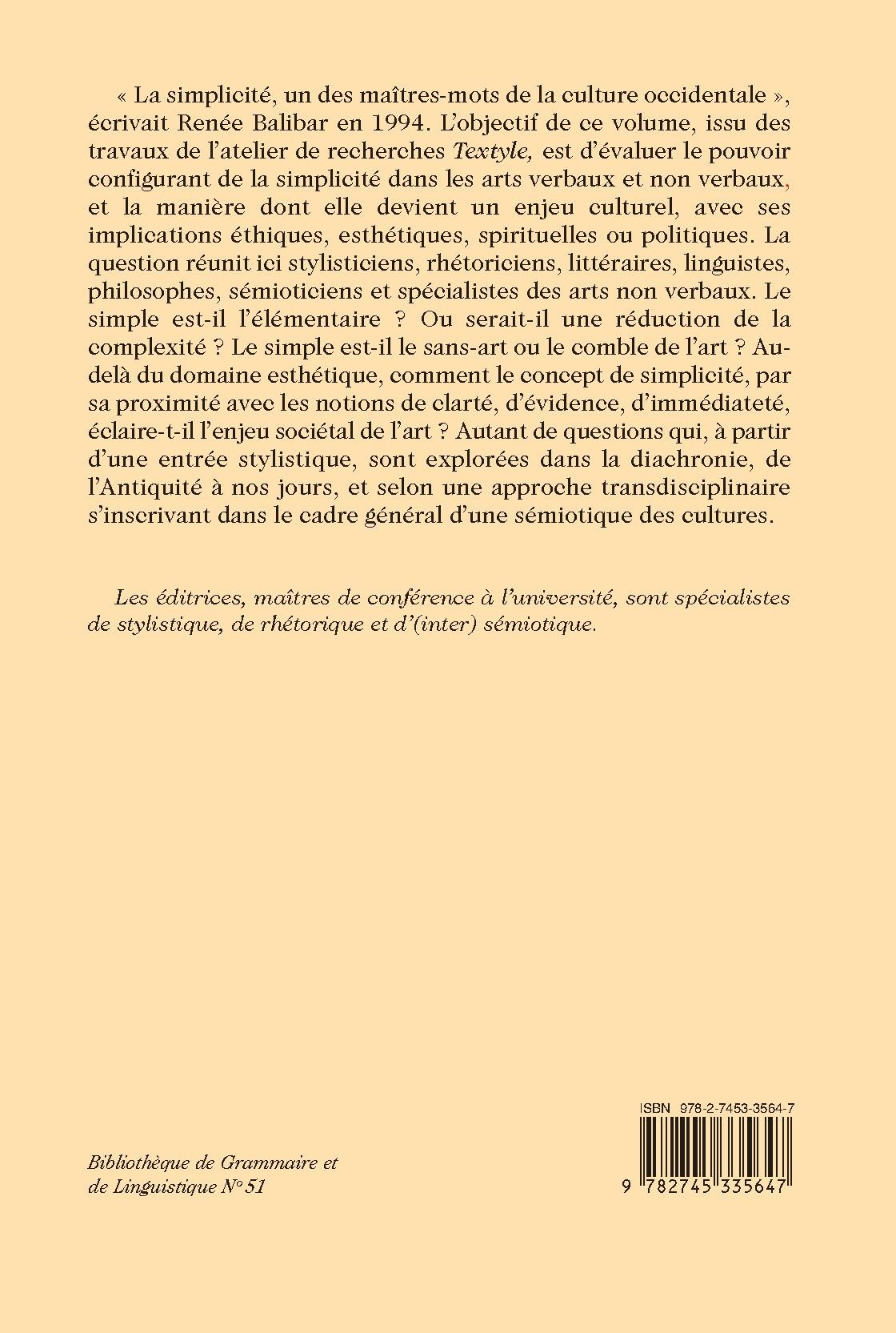 « La simplicité, un des maîtres-mots de la culture occidentale », écrivait Renée Balibar en 1994. L’objectif de ce volume, issu des travaux de l’atelier de recherches Textyle, est d’évaluer le pouvoir configurant de la simplicité dans les arts verbaux et non verbaux, et la manière dont elle devient un enjeu culturel, avec ses implications éthiques, esthétiques, spirituelles ou politiques. La question réunit ici stylisticiens, rhétoriciens, littéraires, linguistes, philosophes, sémioticiens et spécialistes des arts non verbaux. Le simple est-il l’élémentaire ? Ou serait-il une réduction de la complexité ? Le simple est-il le sans-art ou le comble de l’art ? Au-delà du domaine esthétique, comment le concept de simplicité, par sa proximité avec les notions de clarté, d’évidence, d’immédiateté, éclaire-t-il l’enjeu sociétal de l’art ? Autant de questions qui, à partir d’une entrée stylistique, sont explorées dans la diachronie, de l’Antiquité à nos jours, et selon une approche transdisciplinaire s’inscrivant dans le cadre général d’une sémiotique des cultures.