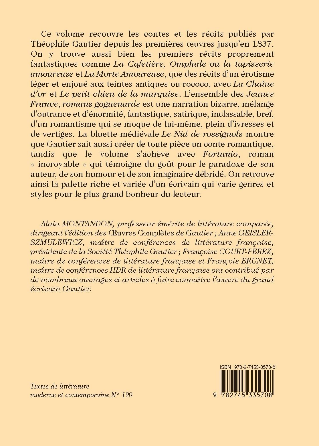 Ce volume recouvre les contes et les récits publiés par Théophile Gautier depuis les premières œuvres jusqu’en 1837. On y trouve aussi bien les premiers récits proprement fantastiques comme La Cafetière, Omphale ou la tapisserie amoureuse et La morte amoureuse, que des récits d’un érotisme léger et enjoué aux teintes antiques ou rococo, avec La Chaîne d’or et Le petit chien de la marquise. L’ensemble des Jeunes France, romans goguenards est une narration bizarre, mélange d’outrance et d’énormité, fantastique, satirique, inclassable, bref, d’un romantisme qui se moque de lui-même, plein d’ivresses et de vertiges. La bluette médiévale Le Nid de rossignols montre que Gautier sait aussi créer de toute pièce un conte romantique, tandis que le volume s’achève avec Fortunio, roman « incroyable » qui témoigne du goût pour le paradoxe de son auteur, de son humour et de son imaginaire débridé. On retrouve ainsi la palette riche et variée d’un écrivain qui varie genres et styles pour le plus grand bonheur du lecteur.