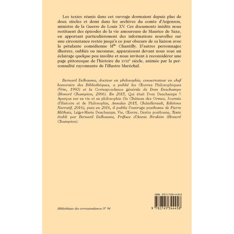Les textes réunis dans cet ouvrage dormaient depuis plus de deux siècles et demi dans les archives du comte d’Argenson, ministre de la Guerre de Louis XV. Ces documents inédits nous restituent des épisodes de la vie amoureuse de Maurice de Saxe, en apportant particulièrement des informations nouvelles sur une circonstance restée jusqu’à ce jour obscure de sa liaison avec la pétulante comédienne Mlle Chantilly. D’autres personnages illustres, oubliés ou inconnus, apparaissent devant nous sous un éclairage quelque peu insolite et nous invitent à reconsidérer une page pittoresque de l’histoire du XVIIIe siècle, animée par la personnalité rayonnante de l’illustre Maréchal.