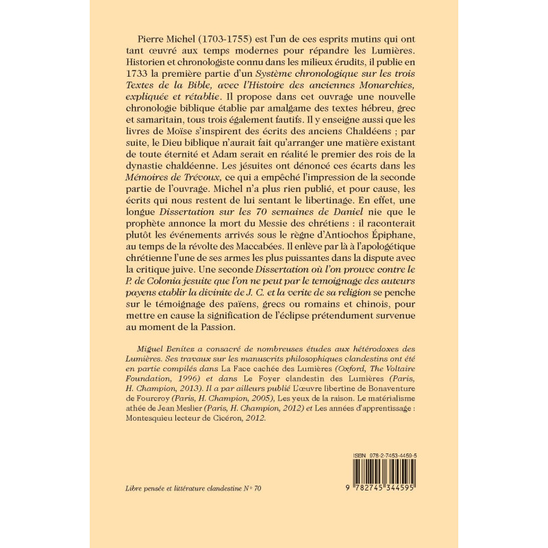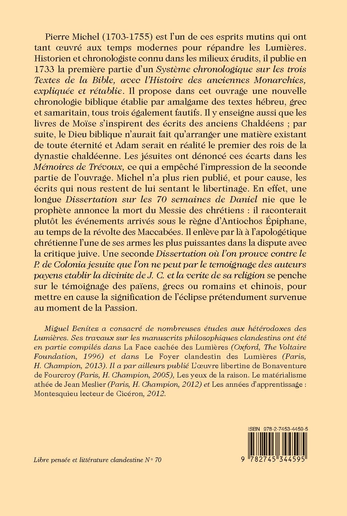 Pierre Michel (1703-1755) est l’un de ces esprits mutins qui ont tant oeuvré aux temps modernes pour répandre les Lumières. Historien et chronologiste connu dans les milieux érudits, il publie en 1733 la première partie d’un Système chronologique sur les trois Textes de la Bible, avec l’Histoire des anciennes Monarchies, expliquée et rétablie. Il propose dans cet ouvrage une nouvelle chronologie biblique établie par amalgame des textes hébreu, grec et samaritain, tous trois également fautifs. Il y enseigne aussi que les livres de Moïse s’inspirent des écrits des anciens Chaldéens ; par suite, le Dieu biblique n’aurait fait qu’arranger une matière existant de toute éternité et Adam serait en réalité le premier des rois de la dynastie chaldéenne. Les jésuites ont dénoncé ces écarts dans les Mémoires de Trévoux, ce qui a empêché l’impression de la seconde partie de l’ouvrage. Michel n’a plus rien publié, et pour cause, les écrits qui nous restent de lui sentant le libertinage. En effet, une longue Dissertation sur les 70 semaines de Daniel nie que le prophète annonce la mort du Messie des chrétiens : il raconterait plutôt les événements arrivés sous le règne d’Antiochos Épiphane, au temps de la révolte des Maccabées. Il enlève par là à l’apologétique chrétienne l’une de ses armes les plus puissantes dans la dispute avec la critique juive. Une seconde Dissertation où l’on prouve contre le P. de Colonia jesuite que l’on ne peut par le temoignage des auteurs payens etablir la divinite de J. C. et la verite de sa religion se penche sur le témoignage des païens, grecs ou romains et chinois, pour mettre en cause la signification de l’éclipse prétendument survenue au moment de la Passion.