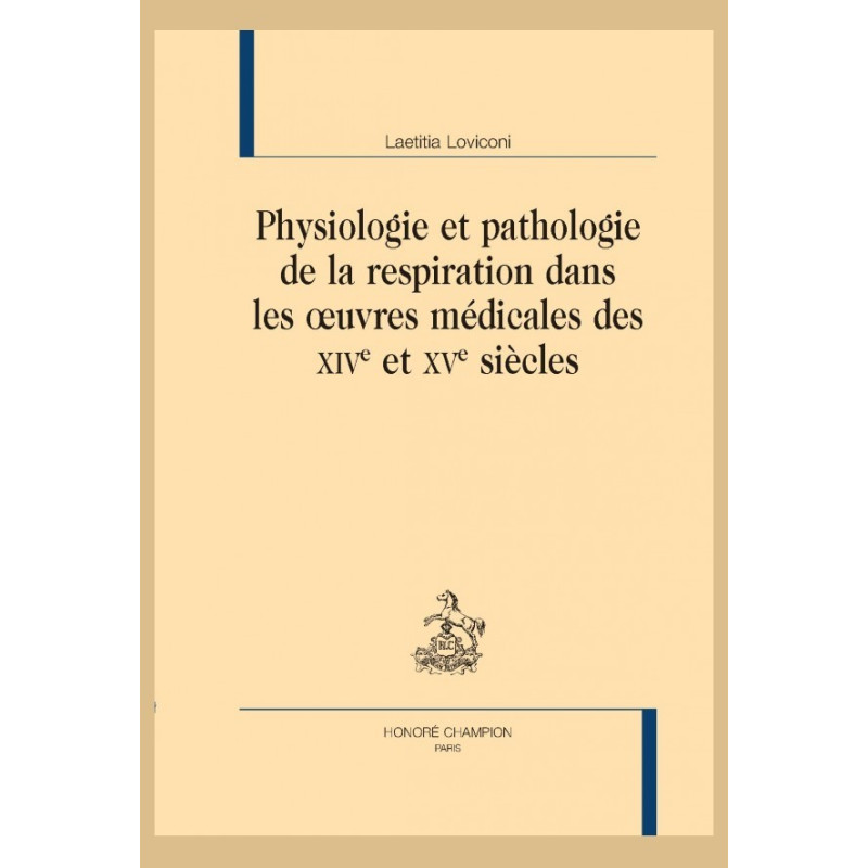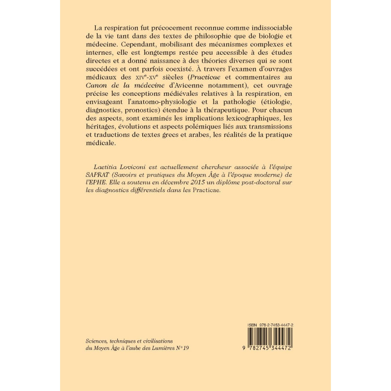 La respiration fut précocement reconnue comme indissociable de la vie tant dans des textes de philosophie que de biologie et médecine. Cependant, mobilisant des mécanismes complexes et internes, elle est longtemps restée peu accessible à des études directes et a donné naissance à des théories diverses qui se sont succédées et ont parfois coexisté. À travers l’examen d’ouvrages médicaux des XIVe-XVe siècles (Practicae et commentaires au Canon de la médecine d’Avicenne notamment), cet ouvrage précise les conceptions médiévales relatives à la respiration, en envisageant l’anatomo-physiologie et la pathologie (étiologie, diagnostics, pronostics) étendue à la thérapeutique. Pour chacun des aspects, sont examinés les implications lexicographiques, les héritages, évolutions et aspects polémiques liés aux transmissions et traductions de textes grecs et arabes, les réalités de la pratique médicale.