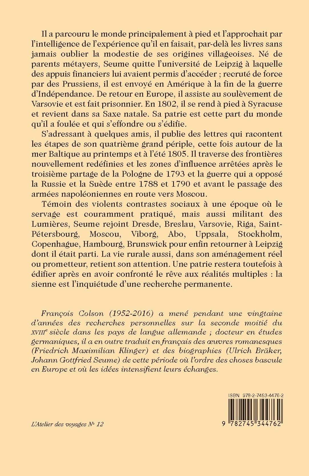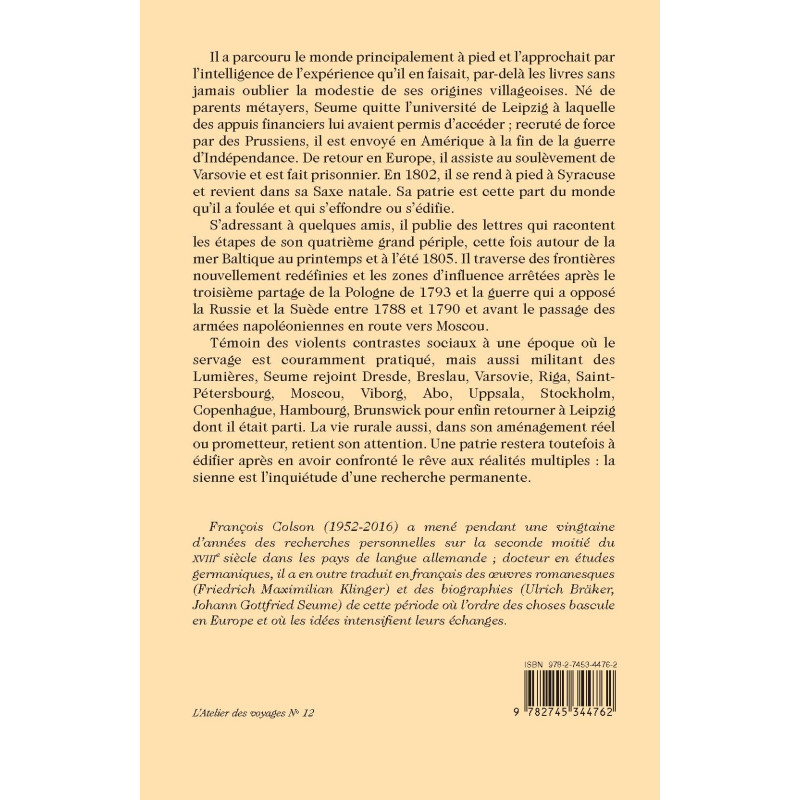 Il a parcouru le monde principalement à pied et l’approchait par l’intelligence de l’expérience qu’il en faisait, par-delà les livres sans jamais oublier la modestie de ses origines villageoises. Né de parents métayers, Seume quitte l’université de Leipzig à laquelle des appuis financiers lui avaient permis d’accéder ; recruté de force par des Prussiens, il est envoyé en Amérique à la fin de la guerre d’Indépendance. De retour en Europe, il assiste au soulèvement de Varsovie et est fait prisonnier. En 1802, il se rend à pied à Syracuse et revient dans sa Saxe natale. Sa patrie est cette part du monde qu’il a foulée et qui s’effondre ou s’édifie.