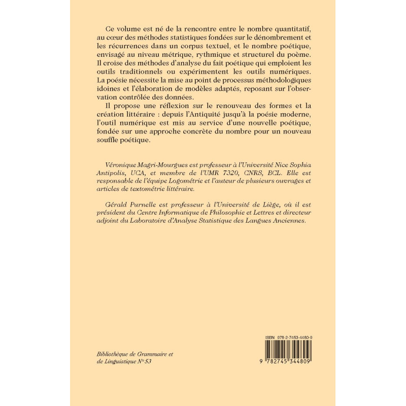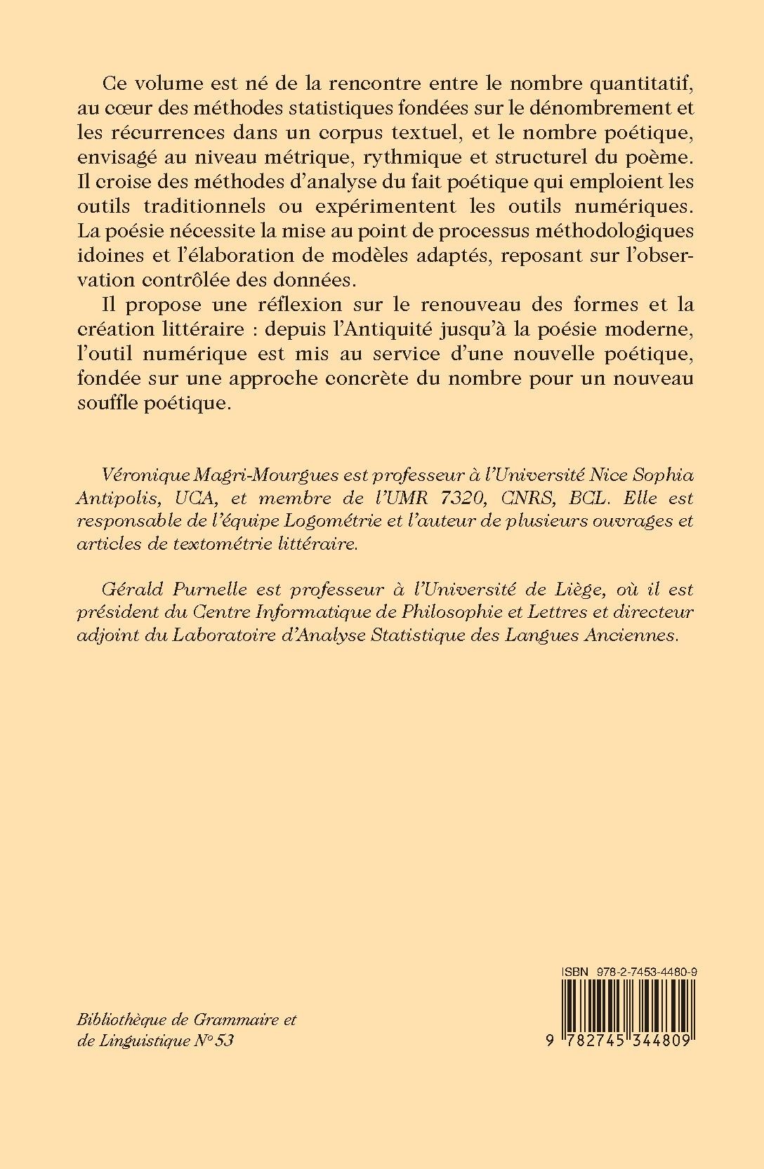 Ce volume est né de la rencontre entre le nombre quantitatif, au cœur des méthodes statistiques fondées sur le dénombrement et les récurrences dans un corpus textuel, et le nombre poétique, envisagé au niveau métrique, rythmique et structurel du poème. Il croise des méthodes d’analyse du fait poétique qui emploient les outils traditionnels ou expérimentent les outils numériques. La poésie nécessite la mise au point de processus méthodologiques idoines et l’élaboration de modèles adaptés, reposant sur l’observation contrôlée des données.