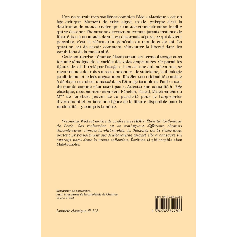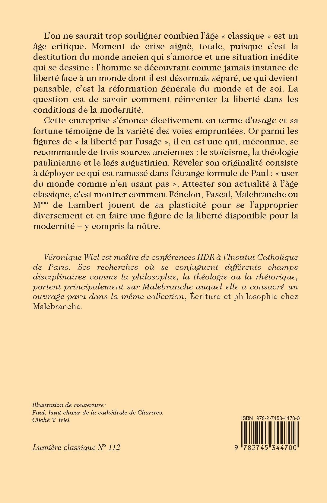 Cette entreprise s’énonce électivement en terme d’usage et sa fortune témoigne de la variété des voies empruntées. Or parmi les figures de « la liberté par l’usage », il en est une qui, méconnue, se recommande de trois sources anciennes : le stoïcisme, la théologie paulinienne et le legs augustinien. Révéler son originalité consiste à déployer ce qui est ramassé dans l’étrange formule de Paul : « user du monde comme n’en usant pas ». Attester son actualité à l’âge classique, c’est montrer comment Fénelon, Pascal, Malebranche ou Mme de Lambert jouent de sa plasticité pour se l’approprier diversement et en faire une figure de la liberté disponible pour la modernité – y compris la nôtre.