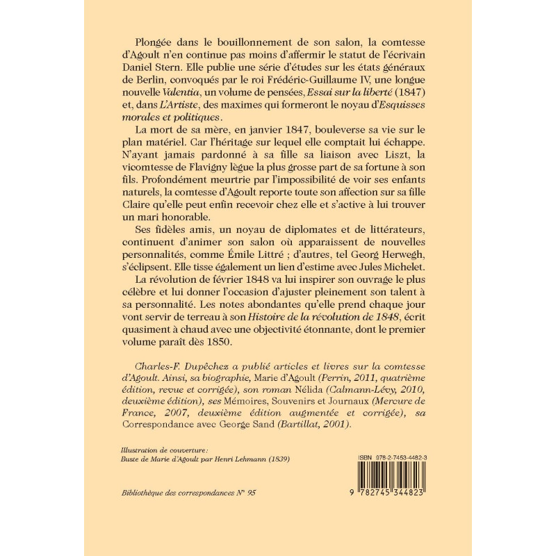 Plongée dans le bouillonnement de son salon, la comtesse d’Agoult n’en continue pas moins d’affermir le statut de l’écrivain Daniel Stern. Elle publie une série d’études sur les états généraux de Berlin, convoqués par le roi Frédéric-Guillaume IV, une longue nouvelle Valentia, un volume de pensées, Essai sur la liberté (1847) et, dans L’Artiste, des maximes qui formeront le noyau d’Esquisses morales et politiques.