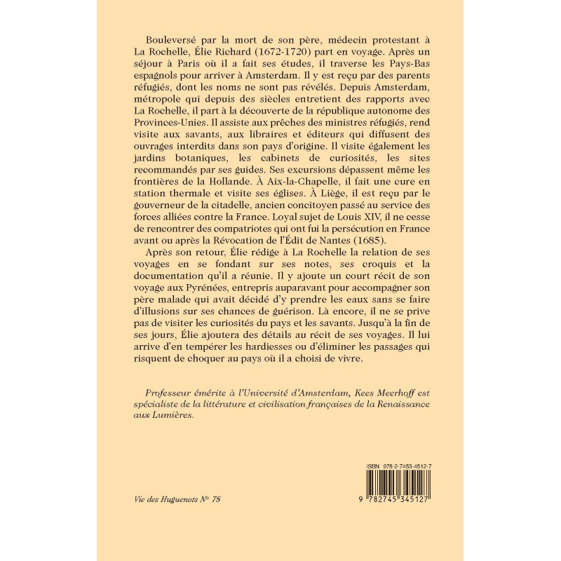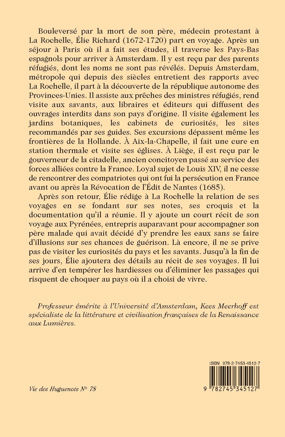 Bouleversé par la mort de son père, médecin protestant à La Rochelle, Élie Richard (1672-1720) part en voyage. Après un séjour à Paris où il a fait ses études, il traverse les Pays-Bas espagnols pour arriver à Amsterdam. Il y est reçu par des parents réfugiés, dont les noms ne sont pas révélés. Depuis Amsterdam, métropole qui depuis des siècles entretient des rapports avec La Rochelle, il part à la découverte de la république autonome des Provinces-Unies. Il assiste aux prêches des ministres réfugiés, rend visite aux savants, aux libraires et éditeurs qui diffusent des ouvrages interdits dans son pays d’origine. Il visite également les jardins botaniques, les cabinets de curiosités, les sites recommandés par ses guides. Ses excursions dépassent même les frontières de la Hollande. À Aix-la-Chapelle, il fait une cure en station thermale et visite ses églises. À Liège, il est reçu par le gouverneur de la citadelle, ancien concitoyen passé au service des forces alliées contre la France. Loyal sujet de Louis XIV, il ne cesse de rencontrer des compatriotes qui ont fui la persécution en France avant ou après la Révocation de l’Édit de Nantes (1685).