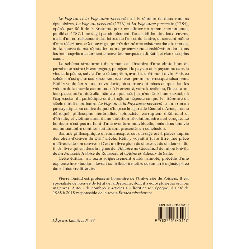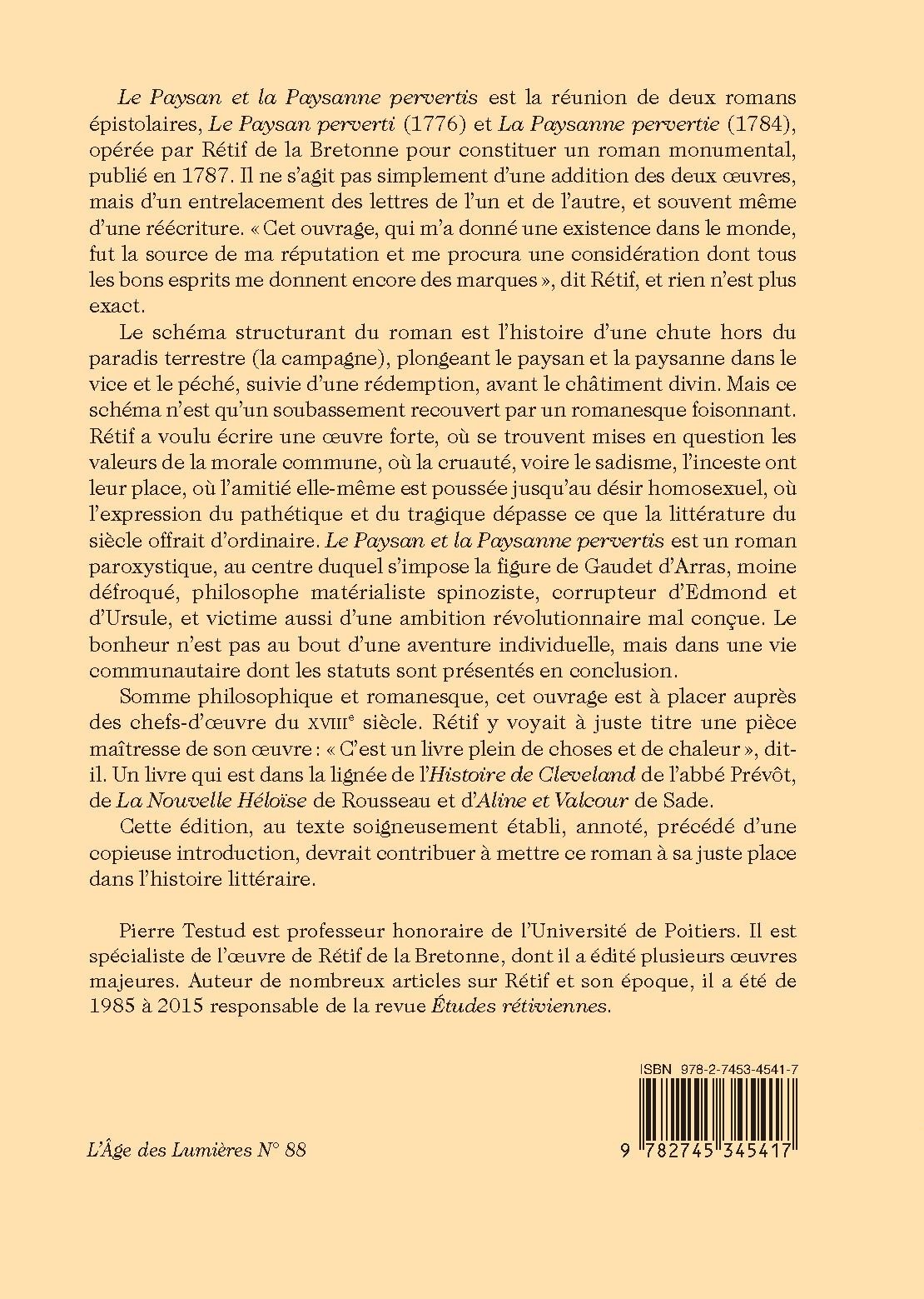 Le Paysan et la Paysanne pervertis est la réunion de deux romans épistolaires, Le Paysan perverti (1776) et La Paysanne pervertie (1784), opérée par Rétif de la Bretonne pour constituer un roman monumental, publié en 1787. Il ne s’agit pas simplement d’une addition des deux oeuvre, mais d’un entrelacement des lettres de l’un et de l’autre, et souvent même d’une réécriture. « Cet ouvrage, qui m’a donné une existence dans le monde, fut la source de ma réputation et me procura une considération dont tous les bons esprits me donnent encore des marques» , dit Rétif, et rien n’est plus exact.