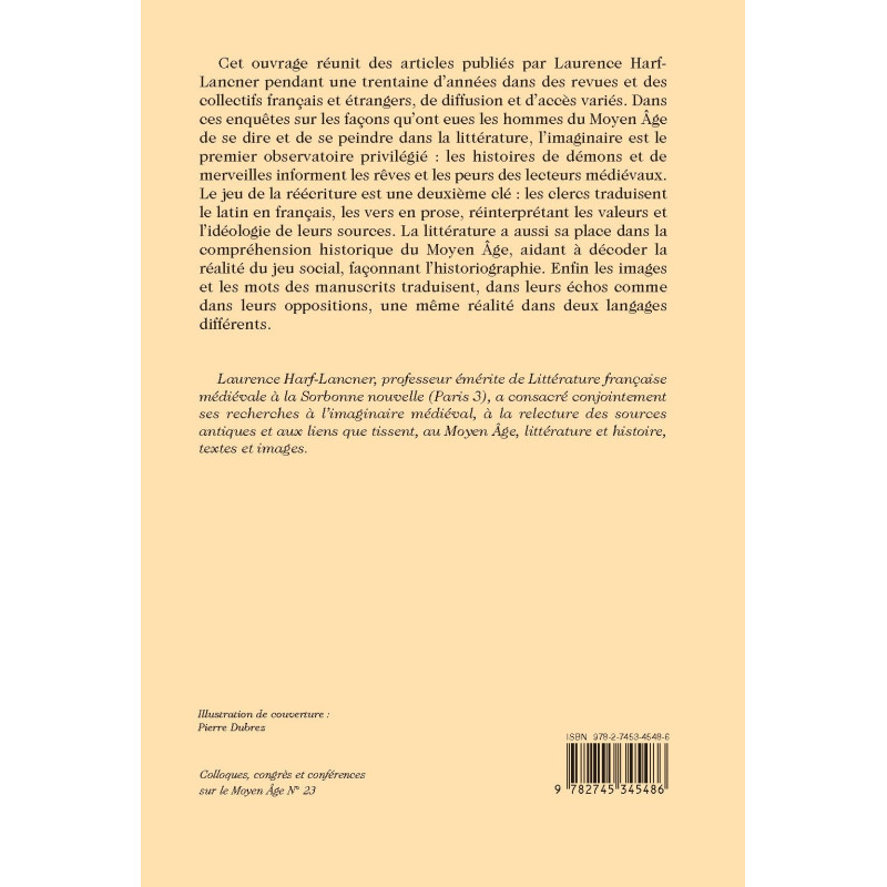 Cet ouvrage réunit des articles publiés par Laurence Harf- Lancner pendant une trentaine d’années dans des revues et des collectifs français et étrangers, de diffusion et d’accès variés. Dans ces enquêtes sur les façons qu’ont eues les hommes du Moyen Âge de se dire et de se peindre dans la littérature, l’imaginaire est le premier observatoire privilégié : les histoires de démons et de merveilles informent les rêves et les peurs des lecteurs médiévaux. Le jeu de la réécriture est une deuxième clé : les clercs traduisent le latin en français, les vers en prose, réinterprétant les valeurs et l’idéologie de leurs sources. La littérature a aussi sa place dans la compréhension historique du Moyen Âge, aidant à décoder la réalité du jeu social, façonnant l’historiographie. Enfin les images et les mots des manuscrits traduisent, dans leurs échos comme dans leurs oppositions, une même réalité dans deux langages différents.