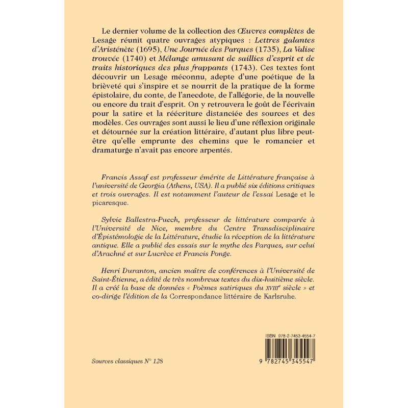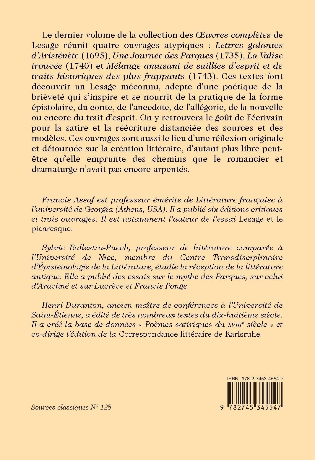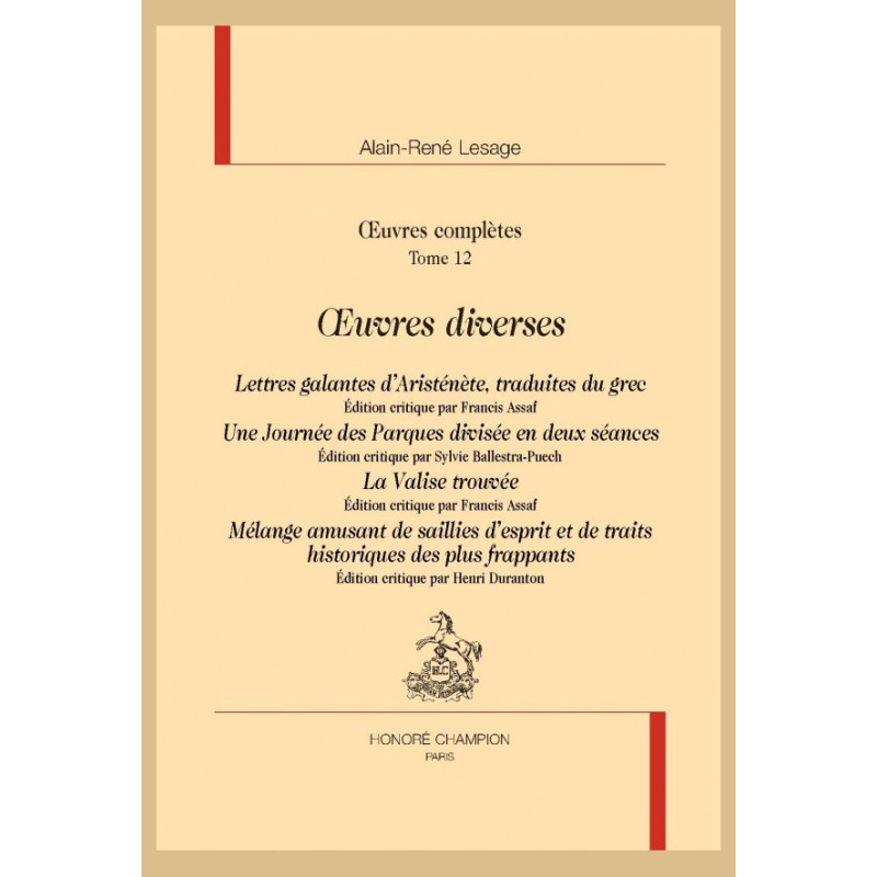 Le dernier volume de la collection des Œuvres complètes de Lesage réunit quatre ouvrages atypiques : Lettres galantes d’Aristénète (1695), Une Journée des Parques (1735), La Valise trouvée (1740) et Mélange amusant de saillies d’esprit et de traits historiques des plus frappants (1743). Ces textes font découvrir un Lesage méconnu, adepte d’une poétique de la brièveté qui s’inspire et se nourrit de la pratique de la forme épistolaire, du conte, de l’anecdote, de l’allégorie, de la nouvelle ou encore du trait d’esprit. On y retrouvera le goût de l’écrivain pour la satire et la réécriture distanciée des sources et des modèles. Ces ouvrages sont aussi le lieu d’une réflexion originale et détournée sur la création littéraire, d’autant plus libre peut-être qu’elle emprunte des chemins que le romancier et dramaturge n’avait pas encore arpentés.