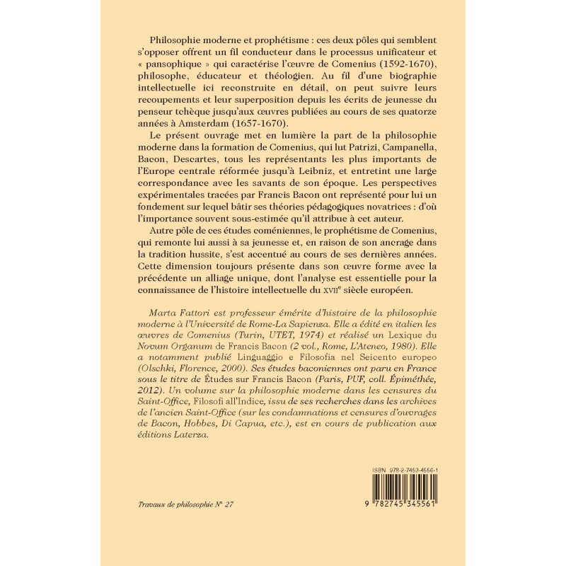 Le présent ouvrage met en lumière la part de la philosophie moderne dans la formation de Comenius, qui lut Patrizi, Campanella, Bacon, Descartes, tous les représentants les plus importants de l’Europe centrale réformée jusqu’à Leibniz, et entretint une large correspondance avec les savants de son époque. Les perspectives expérimentales tracées par Francis Bacon ont représenté pour lui un fondement sur lequel bâtir ses théories pédagogiques novatrices : d’où l’importance souvent sous-estimée qu’il attribue à cet auteur.