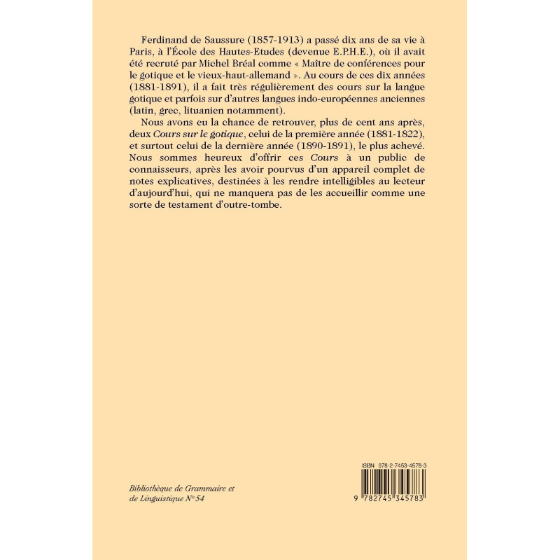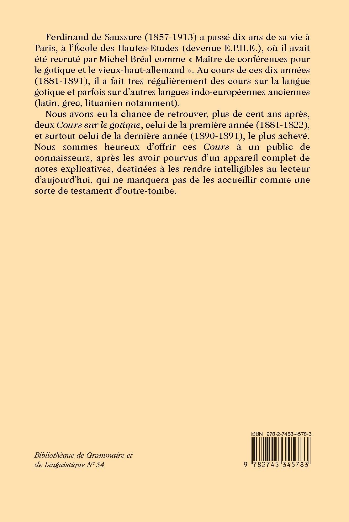 Ferdinand de Saussure (1857-1913) a passé dix ans de sa vie à Paris, à l’École des Hautes-Etudes (devenue E.P.H.E.), où il avait été recruté par Michel Bréal comme « Maître de conférences pour le gotique et le vieux-haut-allemand ». Au cours de ces dix années (1881-1891), il a fait très régulièrement des cours sur la langue gotique et parfois sur d’autres langues indo-européennes anciennes (latin, grec, lituanien notamment).