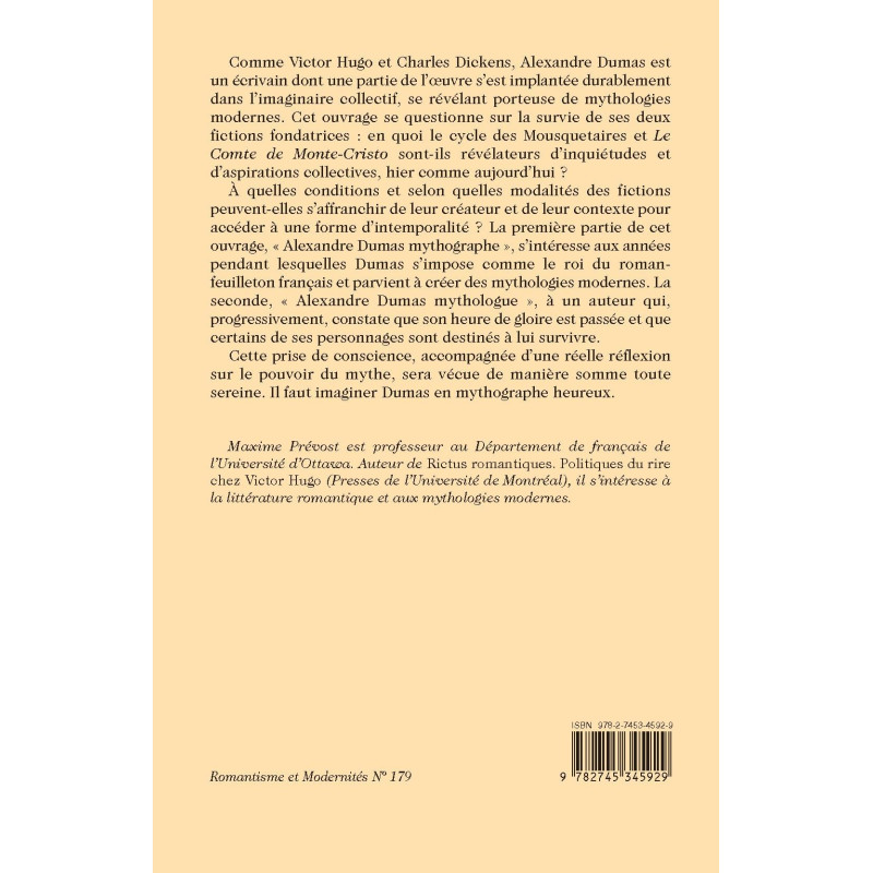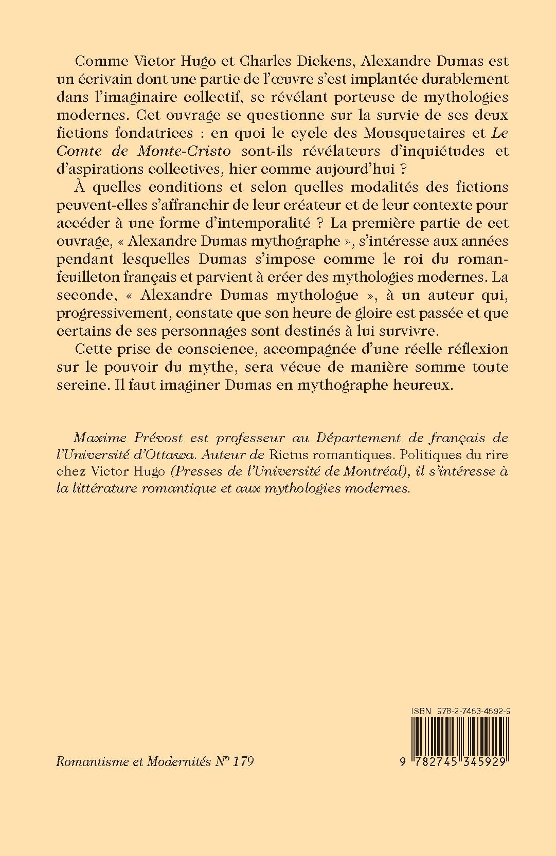 À quelles conditions et selon quelles modalités des fictions peuvent-elles s’affranchir de leur créateur et de leur contexte pour accéder à une forme d’intemporalité ? La première partie de cet ouvrage, « Alexandre Dumas mythographe », s’intéresse aux années pendant lesquelles Dumas s’impose comme le roi du roman-feuilleton français et parvient à créer des mythologies modernes. La seconde, « Alexandre Dumas mythologue », à un auteur qui, progressivement, constate que son heure de gloire est passée et que certains de ses personnages sont destinés à lui survivre.