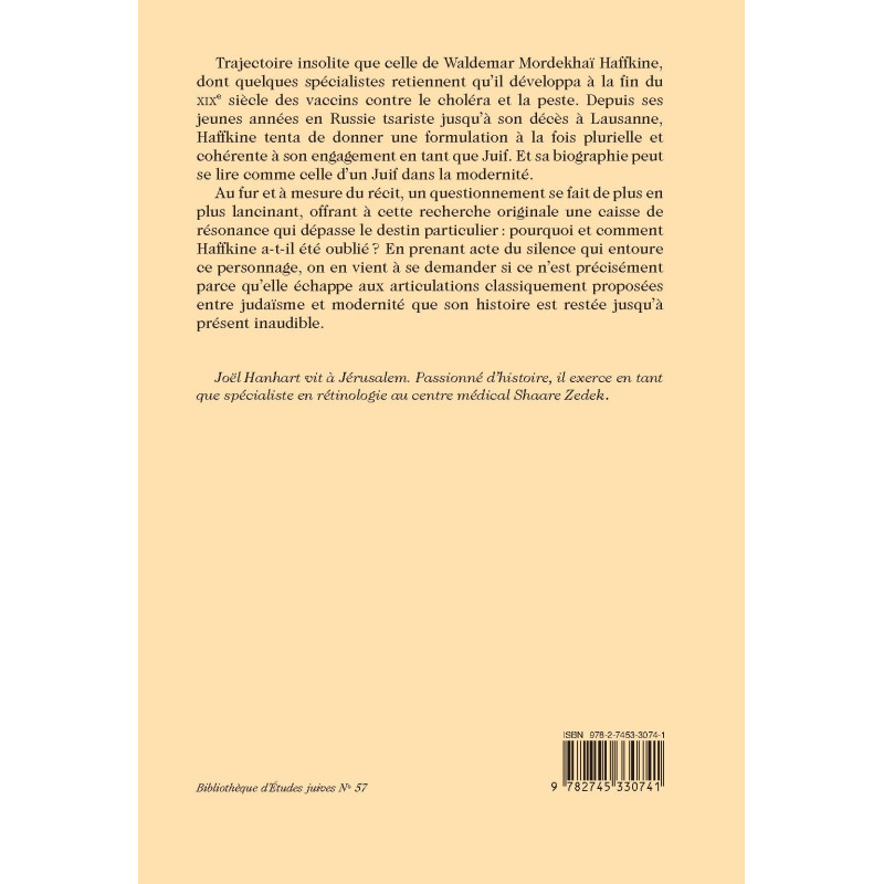 Trajectoire insolite que celle de Waldemar Mordekhaï Haffkine, dont quelques spécialistes retiennent qu’il développa à la fin du XIXe siècle des vaccins contre le choléra et la peste. Depuis ses jeunes années en Russie tsariste jusqu’à son décès à Lausanne, Haffkine tenta de donner une formulation à la fois plurielle et cohérente à son engagement en tant que Juif. Et sa biographie peut se lire comme celle d’un Juif dans la modernité.