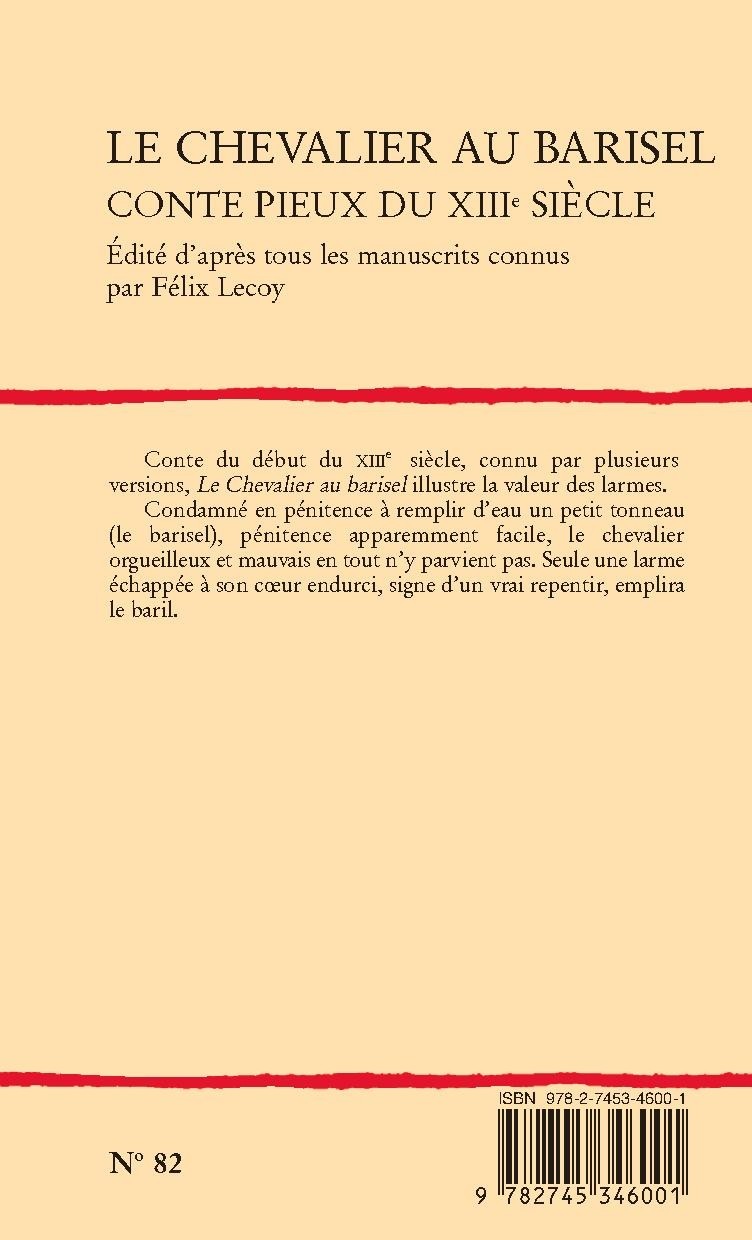 Conte du début du XIIIe siècle, connu par plusieurs versions, Le Chevalier au barisel illustre la valeur des larmes. Condamné en pénitence à remplir d’eau un petit tonneau (le barisel), pénitence apparemment facile, le chevalier orgueilleux et mauvais en tout n’y parvient pas. Seule une larme échappée à son cœur endurci, signe d’un vrai repentir, emplira le baril.
