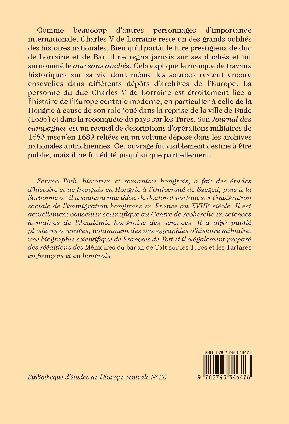 Comme beaucoup d’autres personnages d’importance internationale, Charles V de Lorraine reste un des grands oubliés des histoires nationales. Bien qu’il portât le titre prestigieux de duc de Lorraine et de Bar, il ne régna jamais sur ses duchés et fut surnommé le duc sans duchés. Cela explique le manque de travaux historiques sur sa vie dont même les sources restent encore ensevelies dans différents dépôts d’archives de l’Europe. La personne du duc Charles V de Lorraine est étroitement liée à l’histoire de l’Europe centrale moderne, en particulier à celle de la Hongrie à cause de son rôle joué dans la reprise de la ville de Bude (1686) et dans la reconquête du pays sur les Turcs. Son Journal des campagnes est un recueil de descriptions d’opérations militaires de 1683 jusqu’en 1689 reliées en un volume déposé dans les archives nationales autrichiennes. Cet ouvrage fut visiblement destiné à être publié, mais il ne fut édité jusqu’ici que partiellement.