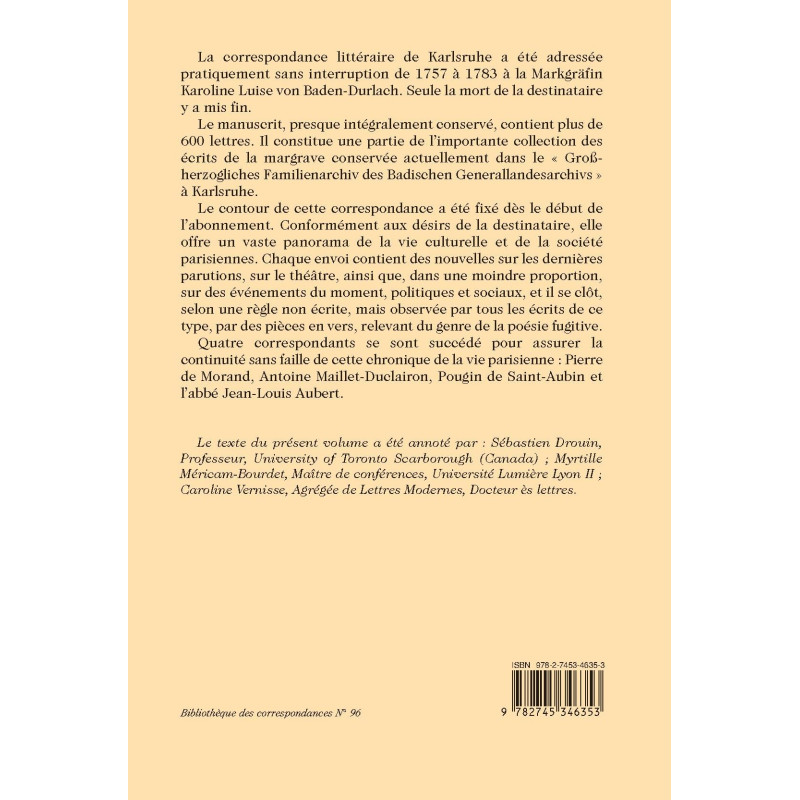 La correspondance littéraire de Karlsruhe a été adressée pratiquement sans interruption de 1757 à 1783 à la Markgräfin Karoline Luise von Baden-Durlach. Seule la mort de la destinataire y a mis fin.