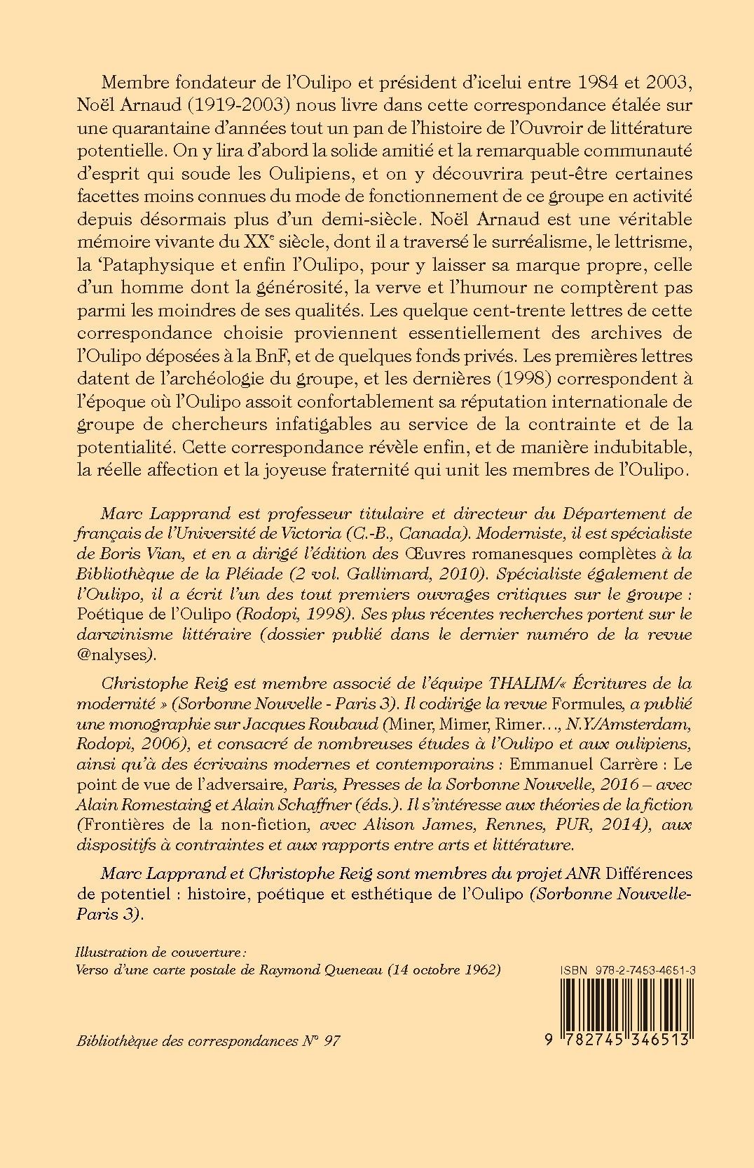 Membre fondateur de l’Oulipo et président d’icelui entre 1984 et 2003, Noël Arnaud (1919-2003) nous livre dans cette correspondance étalée sur une quarantaine d’années tout un pan de l’histoire de l’Ouvroir de littérature potentielle. On y lira d’abord la solide amitié et la remarquable communauté d’esprit qui soude les Oulipiens, et on y découvrira peut-être certaines facettes moins connues du mode de fonctionnement de ce groupe en activité depuis désormais plus d’un demi-siècle. Noël Arnaud est une véritable mémoire vivante du XXe siècle, dont il a traversé le surréalisme, le lettrisme, la ‘Pataphysique et enfin l’Oulipo, pour y laisser sa marque propre, celle d’un homme dont la générosité, la verve et l’humour ne comptèrent pas parmi les moindres de ses qualités. Les quelque cent-trente lettres de cette correspondance choisie proviennent essentiellement des archives de l’Oulipo déposées à la BnF, et de quelques fonds privés. Les premières lettres datent de l’archéologie du groupe, et les dernières (1998) correspondent à l’époque où l’Oulipo assoit confortablement sa réputation internationale de groupe de chercheurs infatigables au service de la contrainte et de la potentialité. Cette correspondance révèle enfin, et de manière indubitable, la réelle affection et la joyeuse fraternité qui unit les membres de l’Oulipo.