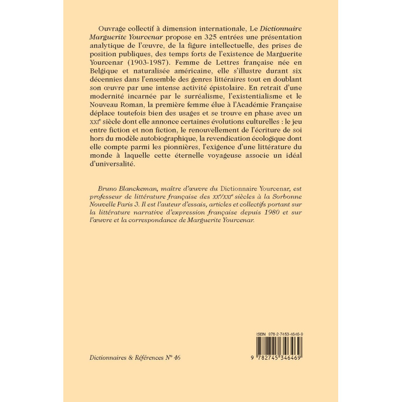 Bruno Blanckeman, maître d’oeuvre du Dictionnaire Yourcenar, est professeur de littérature française des XXe/XXIe siècles à la Sorbonne Nouvelle Paris 3. Il est l’auteur d’essais, articles et collectifs portant sur la littérature narrative d’expression française depuis 1980 et sur l’oeuvre et la correspondance de Marguerite Yourcenar.