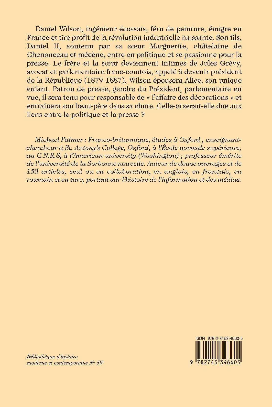 Daniel Wilson, ingénieur écossais, féru de peinture, émigre en France et tire profit de la révolution industrielle naissante. Son fils, Daniel II, soutenu par sa sœur Marguerite, châtelaine de Chenonceau et mécène, entre en politique et se passionne pour la presse. Le frère et la sœur deviennent intimes de Jules Grévy, avocat et parlementaire franc-comtois, appelé à devenir président de la République (1879-1887). Wilson épousera Alice, son unique enfant. Patron de presse, gendre du Président, parlementaire en vue, il sera tenu pour responsable de « l’affaire des décorations » et entraînera son beau-père dans sa chute. Celle-ci serait-elle due aux liens entre la politique et la presse ?