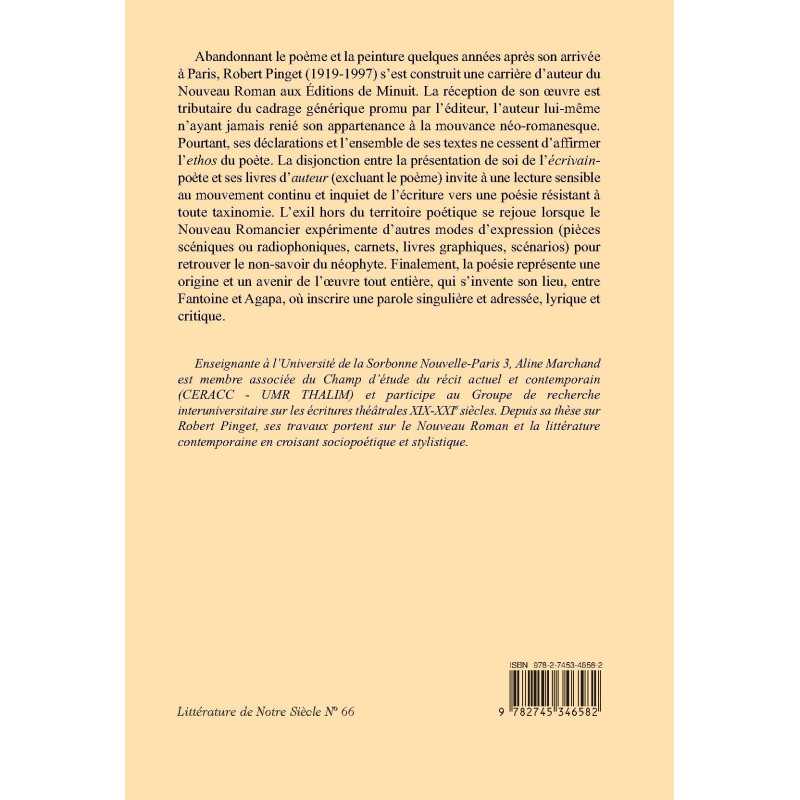 Abandonnant le poème et la peinture quelques années après son arrivée à Paris, Robert Pinget (1919-1997) s’est construit une carrière d’auteur du Nouveau Roman aux Éditions de Minuit. La réception de son oeuvre est tributaire du cadrage générique promu par l’éditeur, l’auteur lui-même n’ayant jamais renié son appartenance à la mouvance néo-romanesque. Pourtant, ses déclarations et l’ensemble de ses textes ne cessent d’affirmer l’ethos du poète. La disjonction entre la présentation de soi de l’écrivain-poète et ses livres d’auteur (excluant le poème) invite à une lecture sensible au mouvement continu et inquiet de l’écriture vers une poésie résistant à toute taxinomie. L’exil hors du territoire poétique se rejoue lorsque le Nouveau Romancier expérimente d’autres modes d’expression (pièces scéniques ou radiophoniques, carnets, livres graphiques, scénarios) pour retrouver le non-savoir du néophyte. Finalement, la poésie représente une origine et un avenir de l’oeuvre tout entière, qui s’invente son lieu, entre Fantoine et Agapa, où inscrire une parole singulière et adressée, lyrique et critique.