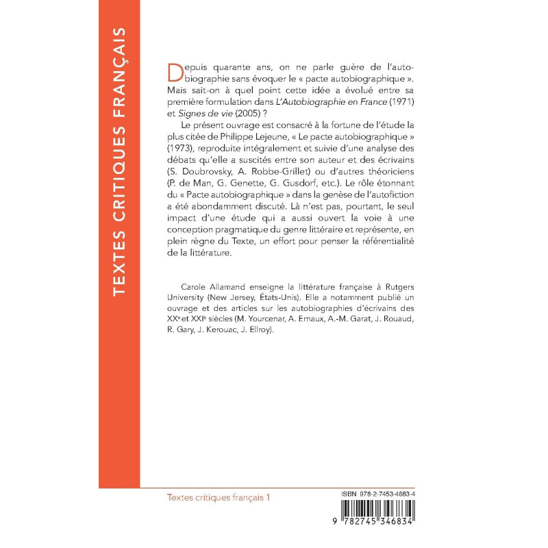 Depuis quarante ans, on ne parle guère de l’autobiographie sans évoquer le « pacte autobiographique ». Mais sait-on à quel point cette idée a évolué entre sa première formulation dans L’Autobiographie en France (1971) et Signes de vie (2005) ? Le présent ouvrage est consacré à la fortune de l’étude la plus citée de Philippe Lejeune, « Le pacte autobiographique » (1973), reproduite intégralement et suivie d’une analyse des débats qu’elle a suscités entre son auteur et des écrivains (S. Doubrovsky, A. Robbe-Grillet) ou d’autres théoriciens (P. de Man, G. Genette, G. Gusdorf, etc.). Le rôle étonnant du « Pacte autobiographique » dans la genèse de l’autofiction a été abondamment discuté. Là n’est pas, pourtant, le seul impact d’une étude qui a aussi ouvert la voie à une conception pragmatique du genre littéraire et représente, en plein règne du Texte, un effort pour penser la référentialité de la littérature.