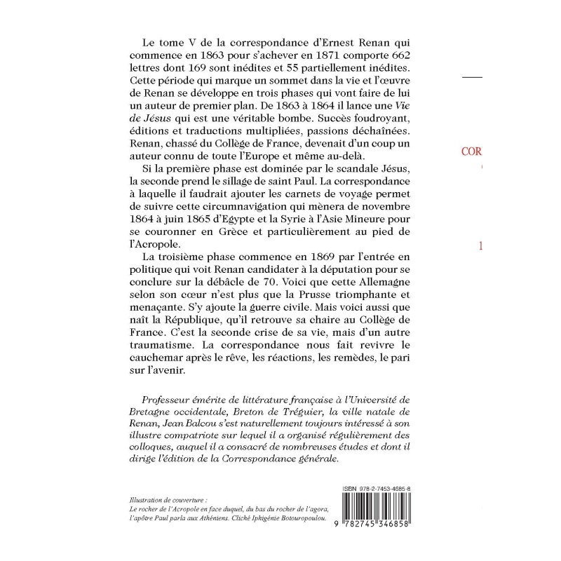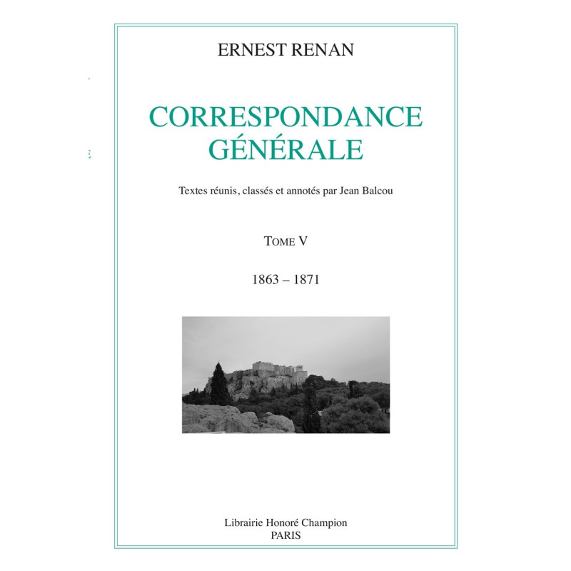Le tome V de la correspondance d’Ernest Renan qui commence en 1863 pour s’achever en 1871 comporte 662 lettres dont 169 sont inédites et 55 partiellement inédites. Cette période qui marque un sommet dans la vie et l’oeuvre de Renan se développe en trois phases qui vont faire de lui un auteur de premier plan. De 1863 à 1864 il lance une Vie de Jésus qui est une véritable bombe. Succès foudroyant, éditions et traductions multipliées, passions déchaînées. Renan, chassé du Collège de France, devenait d’un coup un auteur connu de toute l’Europe et même au-delà.
