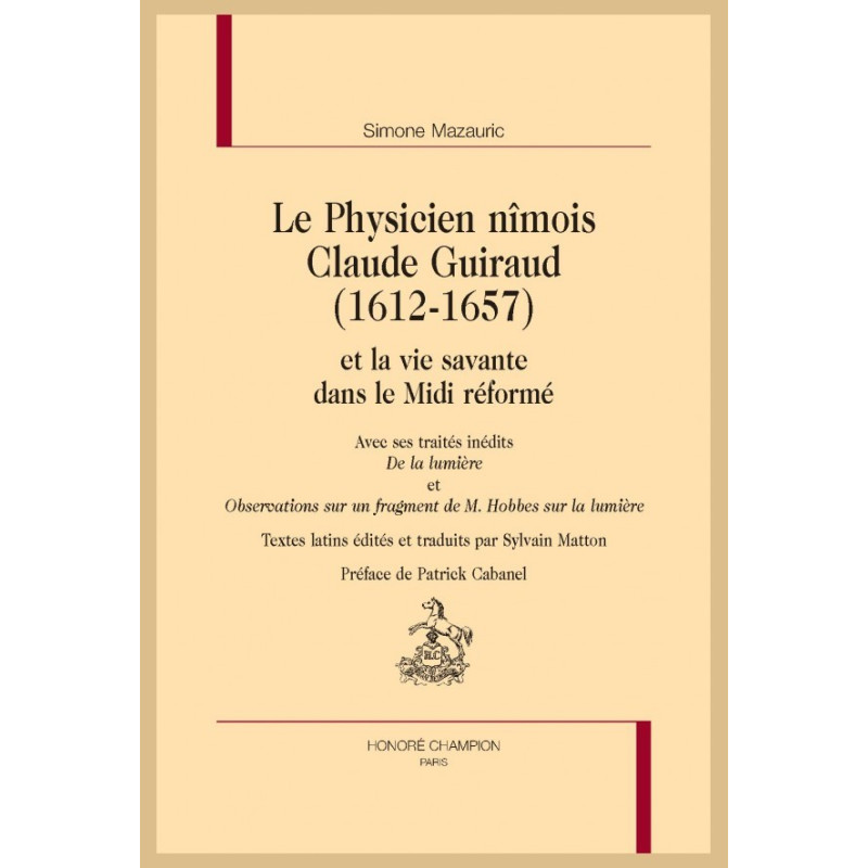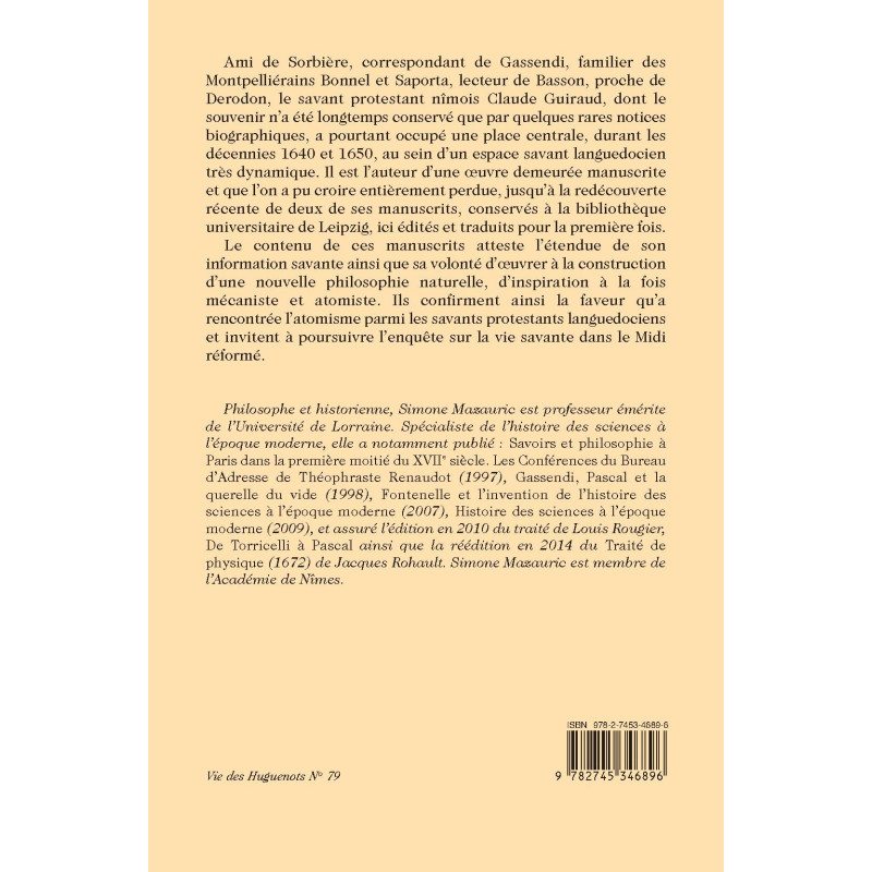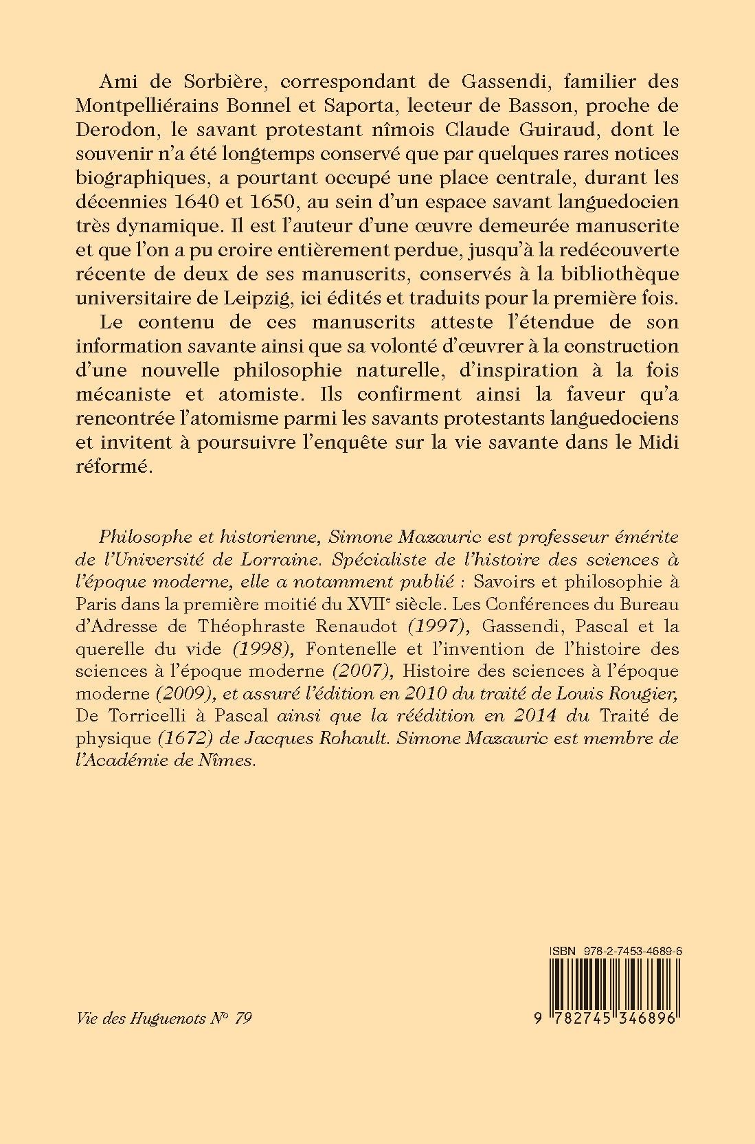 Ami de Sorbière, correspondant de Gassendi, familier des Montpelliérains Bonnel et Saporta, lecteur de Basson, proche de Derodon, le savant protestant nîmois Claude Guiraud, dont le souvenir n’a été longtemps conservé que par quelques rares notices biographiques, a pourtant occupé une place centrale, durant les décennies 1640 et 1650, au sein d’un espace savant languedocien très dynamique. Il est l’auteur d’une oeuvre demeurée manuscrite et que l’on a pu croire entièrement perdue, jusqu’à la redécouverte récente de deux de ses manuscrits, conservés à la bibliothèque universitaire de Leipzig, ici édités et traduits pour la première fois.