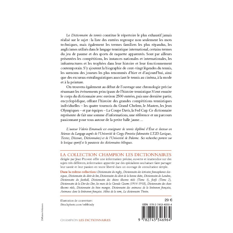 L’auteur Valerio Emanuele est enseignant de tennis diplômé d’État et docteur en Sciences du Langage auprès de l’Université de Cergy-Pontoise (laboratoire LT2D Lexiques, Textes, Discours, Dictionnaires) et de l’Université de Palerme. Ses recherches portent sur le lexique sportif et le paratexte des dictionnaires bilingues.