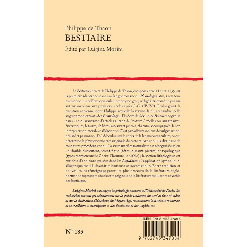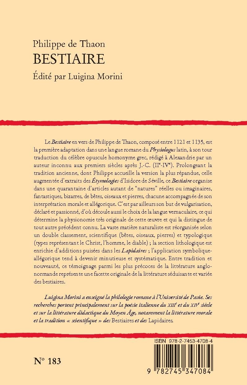 Le Bestiaire en vers de Philippe de Thaon, composé entre 1121 et 1135, est la première adaptation dans une langue romane du Physiologus latin, à son tour traduction du célèbre opuscule homonyme grec, rédigé à Alexandrie par un auteur inconnu aux premiers siècles après J.-C. (IIe-IVe). Prolongeant la tradition ancienne, dont Philippe accueille la version la plus répandue, celle augmentée d’extraits des Étymologies d’Isidore de Séville, ce Bestiaire organise dans une quarantaine d’articles autant de “natures” réelles ou imaginaires, fantastiques, bizarres, de bêtes, oiseaux et pierres, chacune accompagnée de son interprétation morale et allégorique. C’est par ailleurs son but de vulgarisation, déclaré et passionné, d’où découle aussi le choix de la langue vernaculaire, ce qui détermine la physionomie très originale de cette oeuvre et qui la distingue de tout autre précédent connu. La vaste matière naturaliste est réorganisée selon un double classement, scientifique (bêtes, oiseaux, pierres) et typologique (types représentant le Christ, l’homme, le diable) ; la section lithologique est enrichie d’additions puisées dans les Lapidaires ; l’application symbolique-allégorique tend à devenir minutieuse et systématique. Entre tradition et nouveauté, ce témoignage parmi les plus précoces de la littérature anglo-normande représente une facette originale de la littérature séduisante et variée des bestiaires.