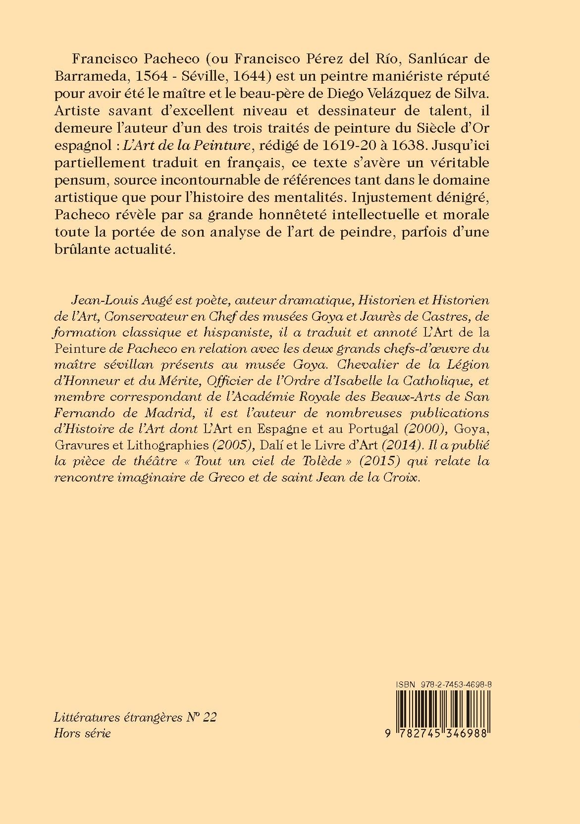 Francisco Pacheco (ou Francisco Pérez del Río, Sanlúcar de Barrameda, 1564 - Séville, 1644) est un peintre maniériste réputé pour avoir été le maître et le beau-père de Diego Velázquez de Silva. Artiste savant d’excellent niveau et dessinateur de talent, il demeure l’auteur d’un des trois traités de peinture du Siècle d’Or espagnol : L’Art de la Peinture, rédigé de 1619-20 à 1638. Jusqu’ici partiellement traduit en français, ce texte s’avère un véritable pensum, source incontournable de références tant dans le domaine artistique que pour l’histoire des mentalités. Injustement dénigré, Pacheco révèle par sa grande honnêteté intellectuelle et morale toute la portée de son analyse de l’art de peindre, parfois d’une brûlante actualité.