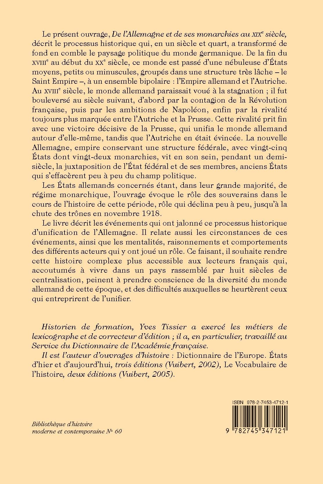 Le présent ouvrage, De l’Allemagne et de ses monarchies au XIXe siècle, décrit le processus historique qui, en un siècle et quart, a transformé de fond en comble le paysage politique du monde germanique. De la fin du XVIIIe au début du XXe siècle, ce monde est passé d’une nébuleuse d’États moyens, petits ou minuscules, groupés dans une structure très lâche – le Saint Empire –, à un ensemble bipolaire : l’Empire allemand et l’Autriche. Au XVIIIe siècle, le monde allemand paraissait voué à la stagnation ; il fut bouleversé au siècle suivant, d’abord par la contagion de la Révolution française, puis par les ambitions de Napoléon, enfin par la rivalité toujours plus marquée entre l’Autriche et la Prusse. Cette rivalité prit fin avec une victoire décisive de la Prusse, qui unifia le monde allemand autour d’elle-même, tandis que l’Autriche en était évincée. La nouvelle Allemagne, empire conservant une structure fédérale, avec vingt-cinq États dont vingt-deux monarchies, vit en son sein, pendant un demi-siècle, la juxtaposition de l’État fédéral et de ses membres, anciens États qui s’effacèrent peu à peu du champ politique.