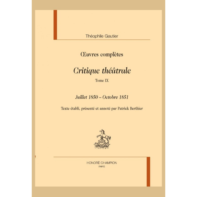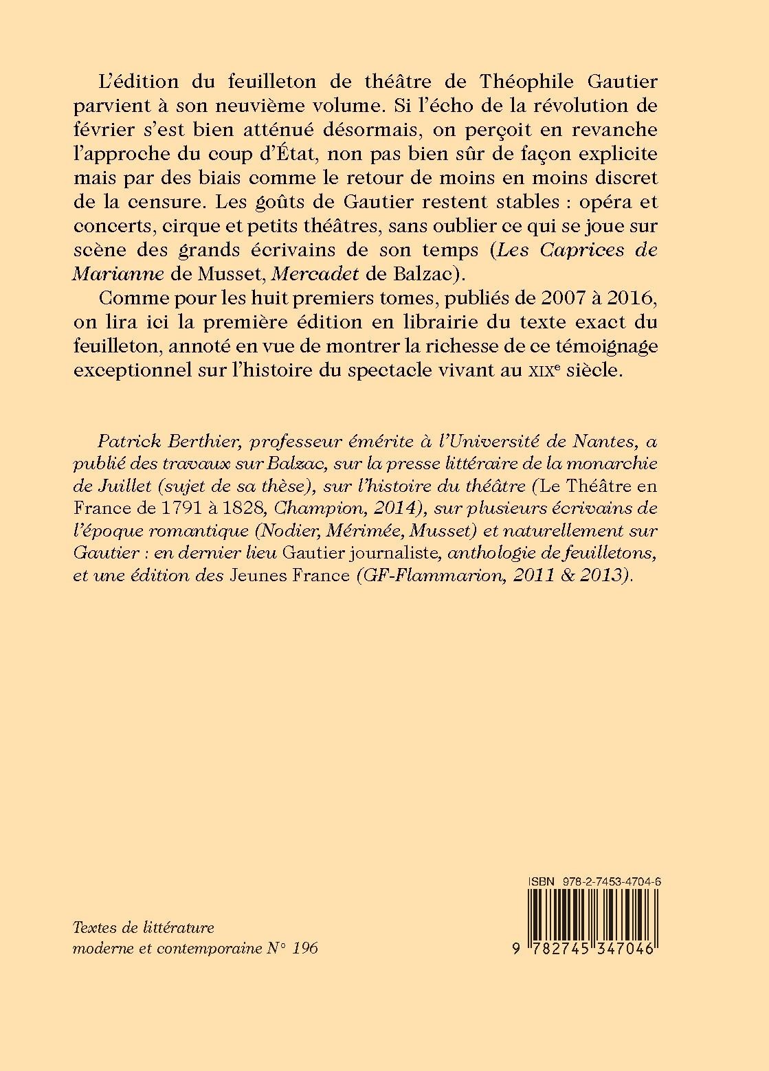 L’édition du feuilleton de théâtre de Théophile Gautier parvient à son neuvième volume. Si l’écho de la révolution de février s’est bien atténué désormais, on perçoit en revanche l’approche du coup d’État, non pas bien sûr de façon explicite mais par des biais comme le retour de moins en moins discret de la censure. Les goûts de Gautier restent stables : opéra et concerts, cirque et petits théâtres, sans oublier ce qui se joue sur scène des grands écrivains de son temps (Les Caprices de Marianne de Musset, Mercadet de Balzac).