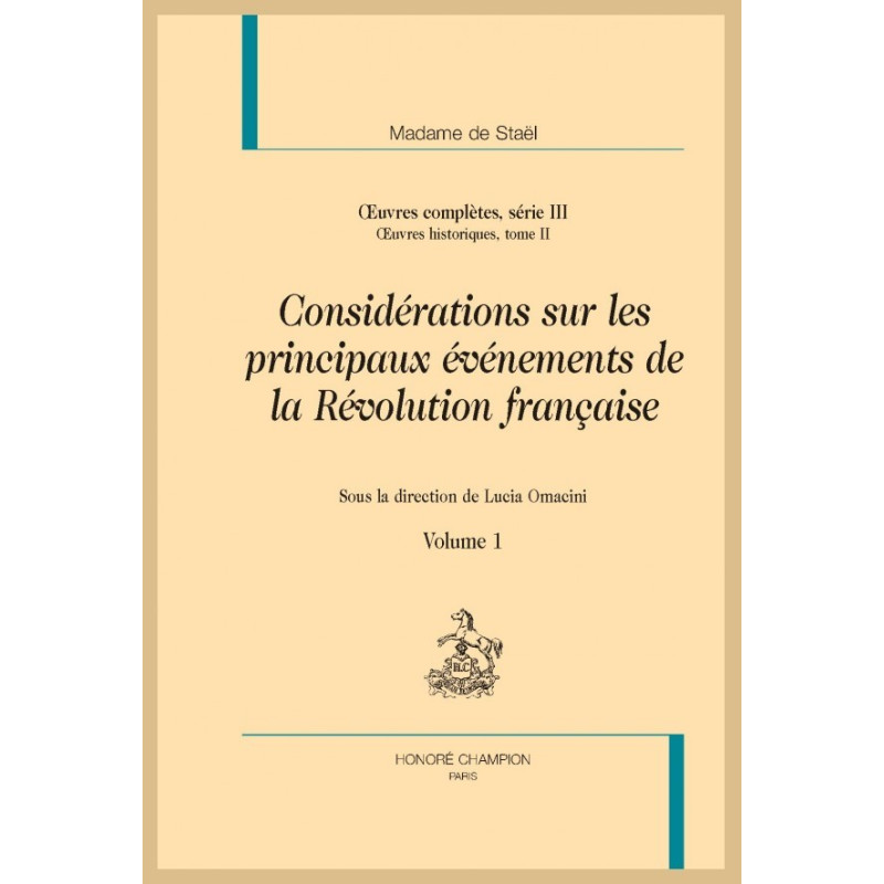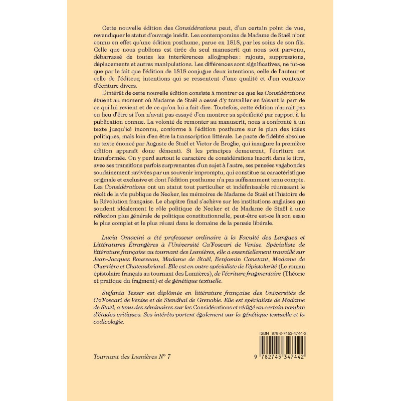 Cette nouvelle édition des Considérations peut, d’un certain point de vue, revendiquer le statut d’ouvrage inédit. Les contemporains de Madame de Staël n’ont connu en effet qu’une édition posthume, parue en 1818, par les soins de son fils. Celle que nous publions est tirée du seul manuscrit qui nous soit parvenu, débarrassé de toutes les interférences allographes : rajouts, suppressions, déplacements et autres manipulations. Les différences sont significatives, ne fut-ce que par le fait que l’édition de 1818 conjugue deux intentions, celle de l’auteur et celle de l’éditeur, intentions qui se ressentent d’une qualité et d’un contexte d’écriture divers.
