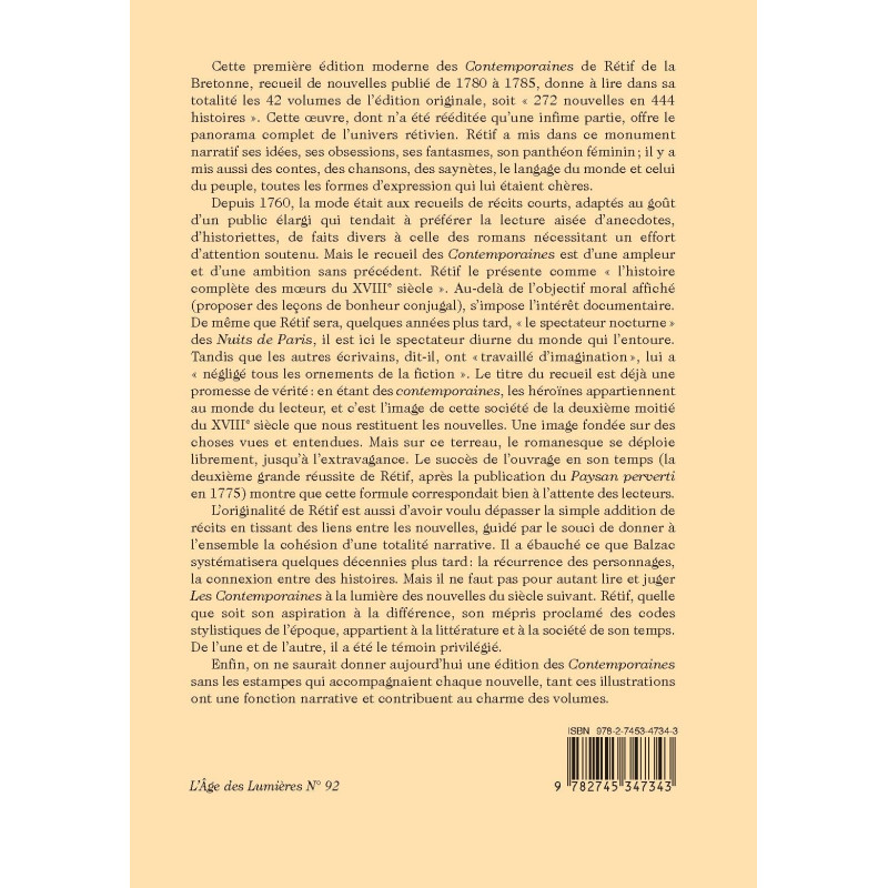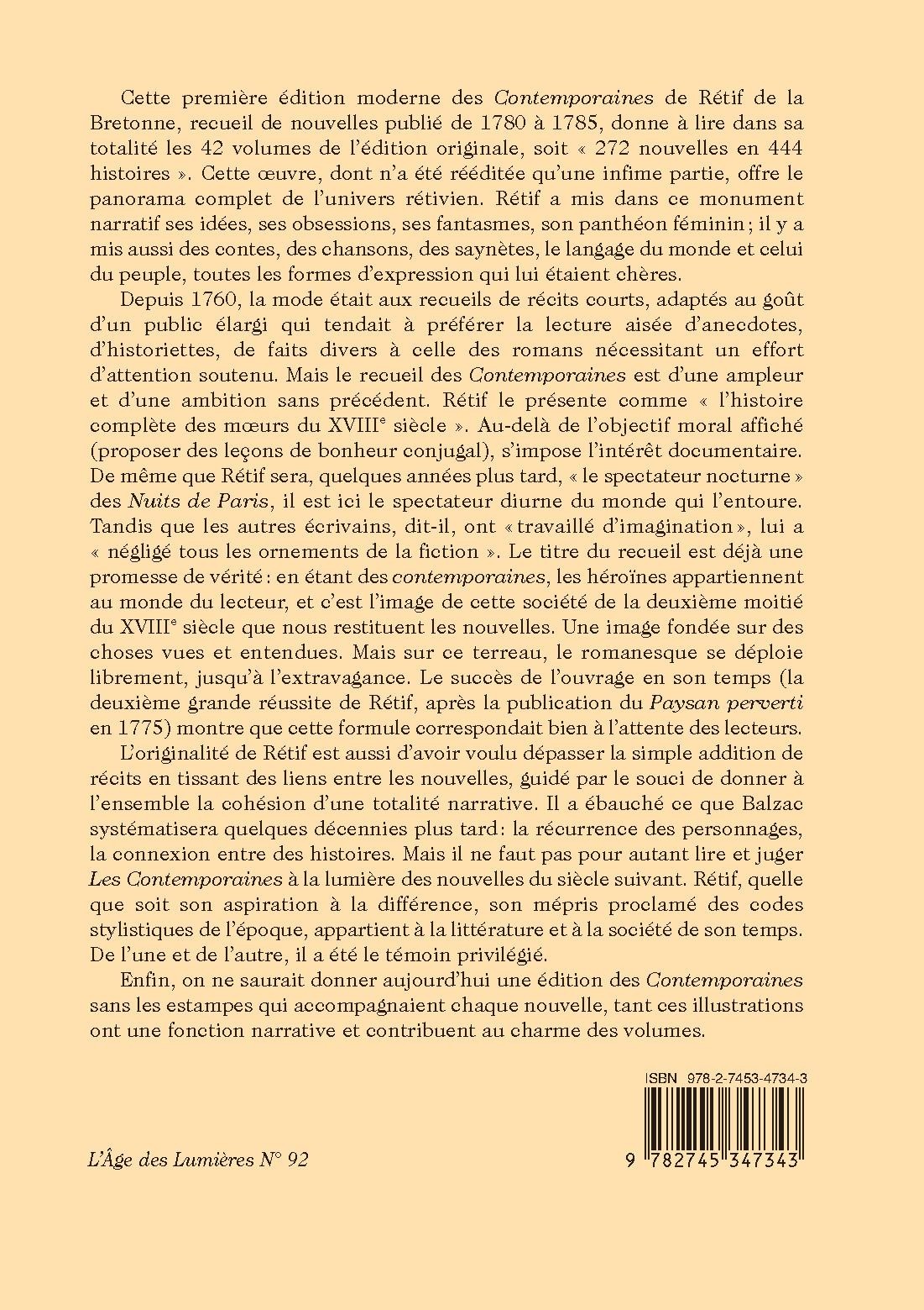 Cette première édition moderne des Contemporaines de Rétif de la Bretonne, recueil de nouvelles publié de 1780 à 1785, donne à lire dans sa totalité les 42 volumes de l’édition originale, soit « 272 nouvelles en 444 histoires ». Cette oeuvre, dont n’a été rééditée qu’une infime partie, offre le panorama complet de l’univers rétivien. Rétif a mis dans ce monument narratif ses idées, ses obsessions, ses fantasmes, son panthéon féminin ; il y a mis aussi des contes, des chansons, des saynètes, le langage du monde et celui du peuple, toutes les formes d’expression qui lui étaient chères.