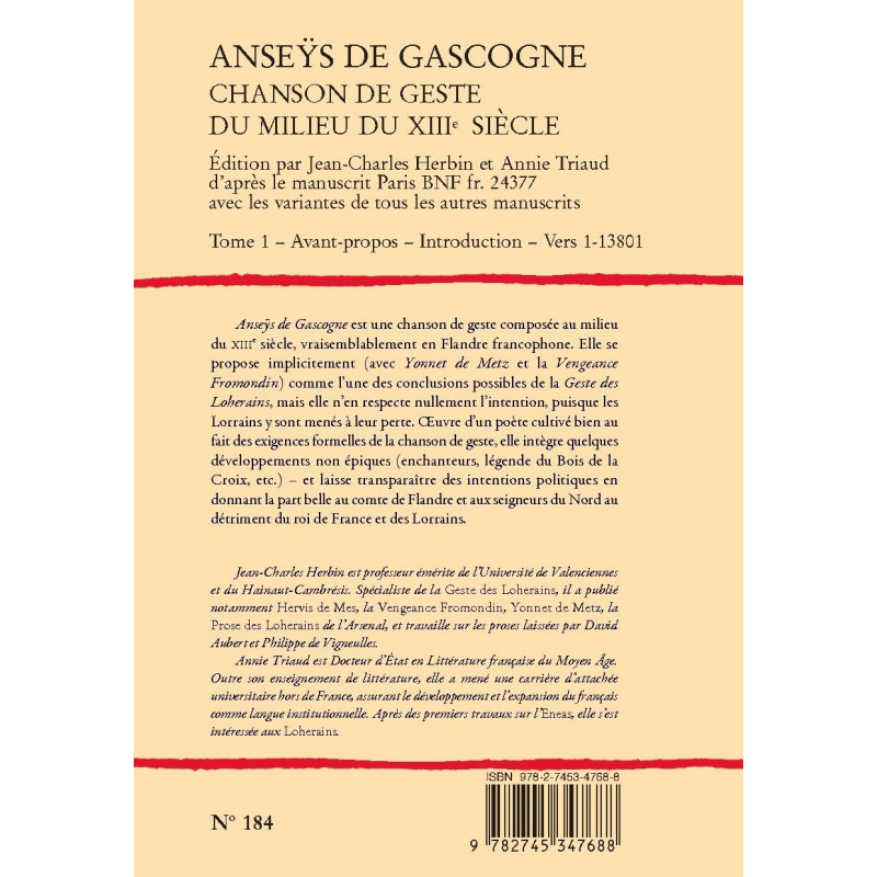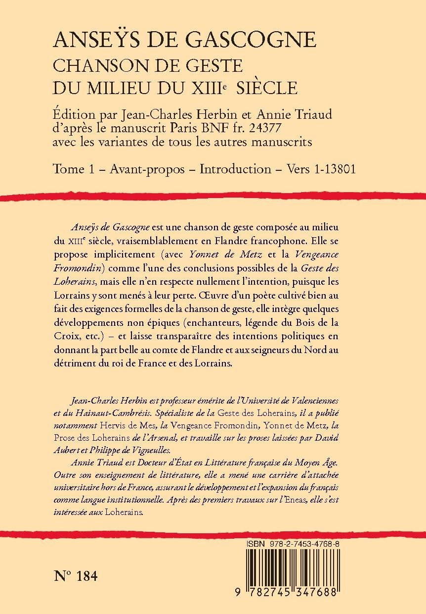 Jean-Charles Herbin est professeur émérite de l’Université de Valenciennes et du Hainaut-Cambrésis. Spécialiste de la Geste des Loherains, il a publié notamment Hervis de Mes, la Vengeance Fromondin, Yonnet de Metz, la Prose des Loherains de l’Arsenal, et travaille sur les proses laissées par David Aubert et Philippe de Vigneulles.