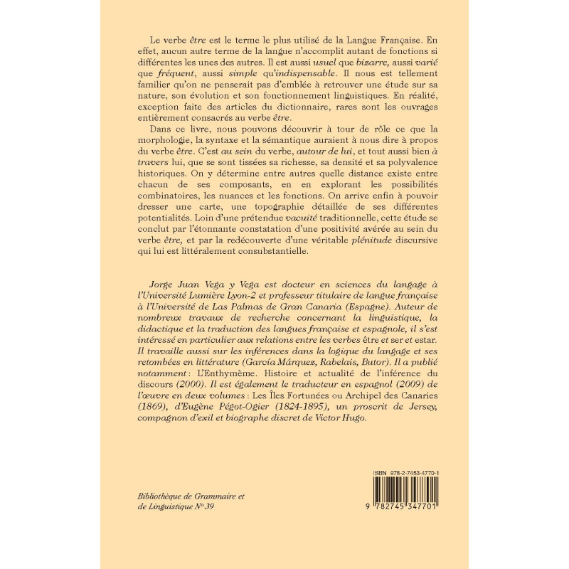 Dans ce livre, nous pouvons découvrir à tour de rôle ce que la morphologie, la syntaxe et la sémantique auraient à nous dire à propos du verbe être. C’est au sein du verbe, autour de lui, et tout aussi bien à travers lui, que se sont tissées sa richesse, sa densité et sa polyvalence historiques. On y détermine entre autres quelle distance existe entre chacun de ses composants, en en explorant les possibilités combinatoires, les nuances et les fonctions. On arrive enfin à pouvoir dresser une carte, une topographie détaillée de ses différentes potentialités. Loin d’une prétendue vacuité traditionnelle, cette étude se conclut par l’étonnante constatation d’une positivité avérée au sein du verbe être, et par la redécouverte d’une véritable plénitude discursive qui lui est littéralement consubstantielle.