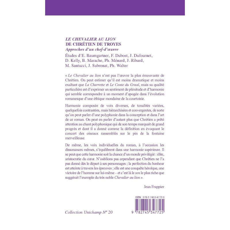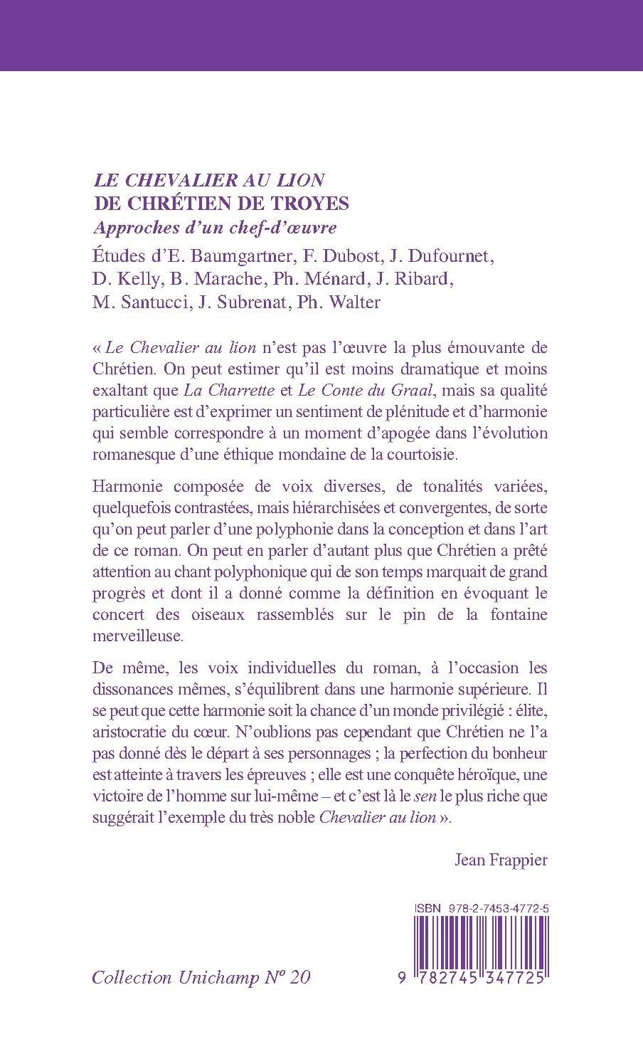 De même, les voix individuelles du roman, à l’occasion les dissonances mêmes, s’équilibrent dans une harmonie supérieure. Il se peut que cette harmonie soit la chance d’un monde privilégié : élite, aristocratie du cœur. N’oublions pas cependant que Chrétien ne l’a pas donné dès le départ à ses personnages ; la perfection du bonheur est atteinte à travers les épreuves ; elle est une conquête héroïque, une victoire de l’homme sur lui-même – et c’est là le sen le plus riche que suggérait l’exemple du très noble Chevalier au lion ».