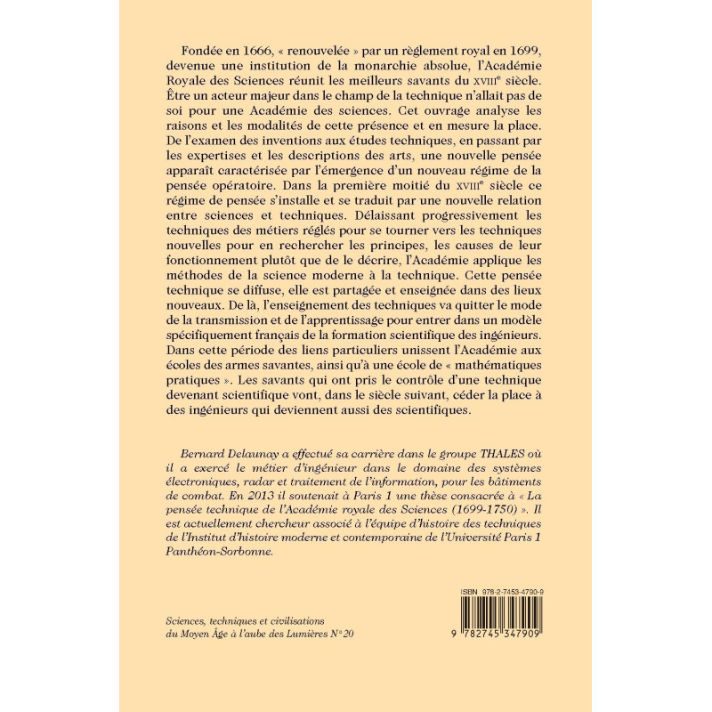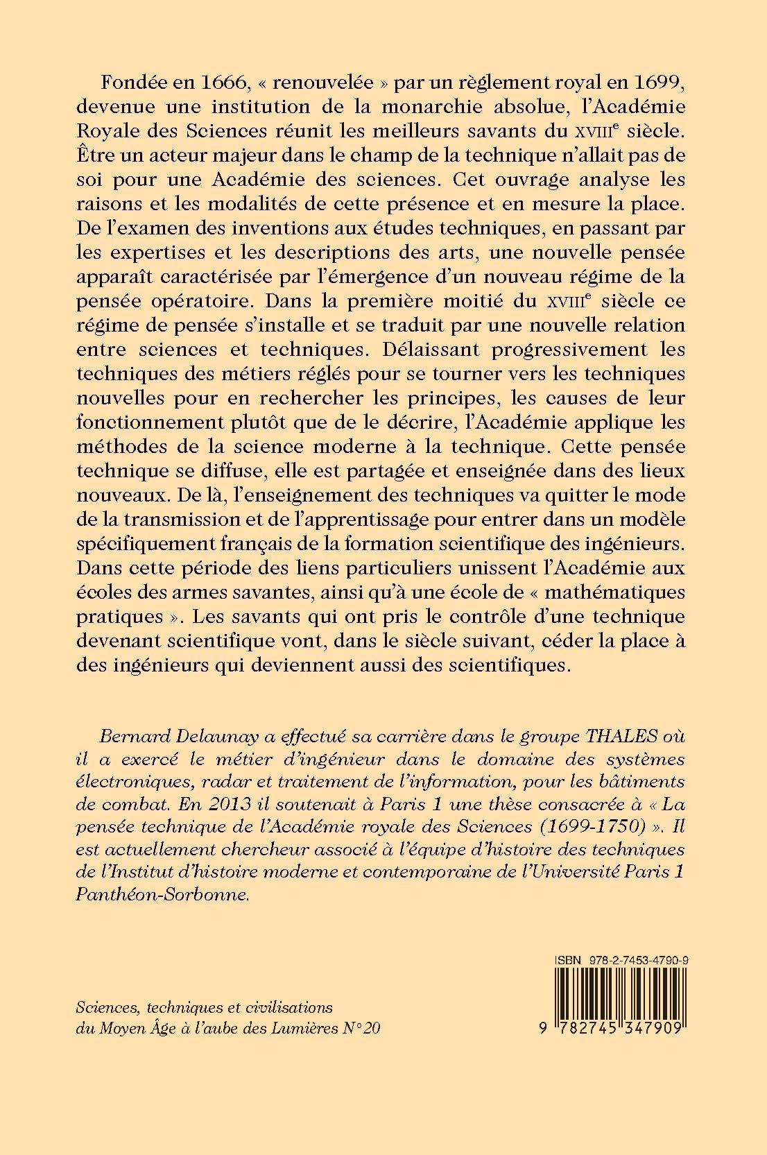 Fondée en 1666, « renouvelée » par un règlement royal en 1699, devenue une institution de la monarchie absolue, l’Académie Royale des Sciences réunit les meilleurs savants du XVIIIe siècle. Être un acteur majeur dans le champ de la technique n’allait pas de soi pour une Académie des sciences. Cet ouvrage analyse les raisons et les modalités de cette présence et en mesure la place. De l’examen des inventions aux études techniques, en passant par les expertises et les descriptions des arts, une nouvelle pensée apparaît caractérisée par l’émergence d’un nouveau régime de la pensée opératoire. Dans la première moitié du XVIIIe siècle ce régime de pensée s’installe et se traduit par une nouvelle relation entre sciences et techniques. Délaissant progressivement les techniques des métiers réglés pour se tourner vers les techniques nouvelles pour en rechercher les principes, les causes de leur fonctionnement plutôt que de le décrire, l’Académie applique les méthodes de la science moderne à la technique. Cette pensée technique se diffuse, elle est partagée et enseignée dans des lieux nouveaux. De là, l’enseignement des techniques va quitter le mode de la transmission et de l’apprentissage pour entrer dans un modèle spécifiquement français de la formation scientifique des ingénieurs. Dans cette période des liens particuliers unissent l’Académie aux écoles des armes savantes, ainsi qu’à une école de « mathématiques pratiques ». Les savants qui ont pris le contrôle d’une technique devenant scientifique vont, dans le siècle suivant, céder la place à des ingénieurs qui deviennent aussi des scientifiques.