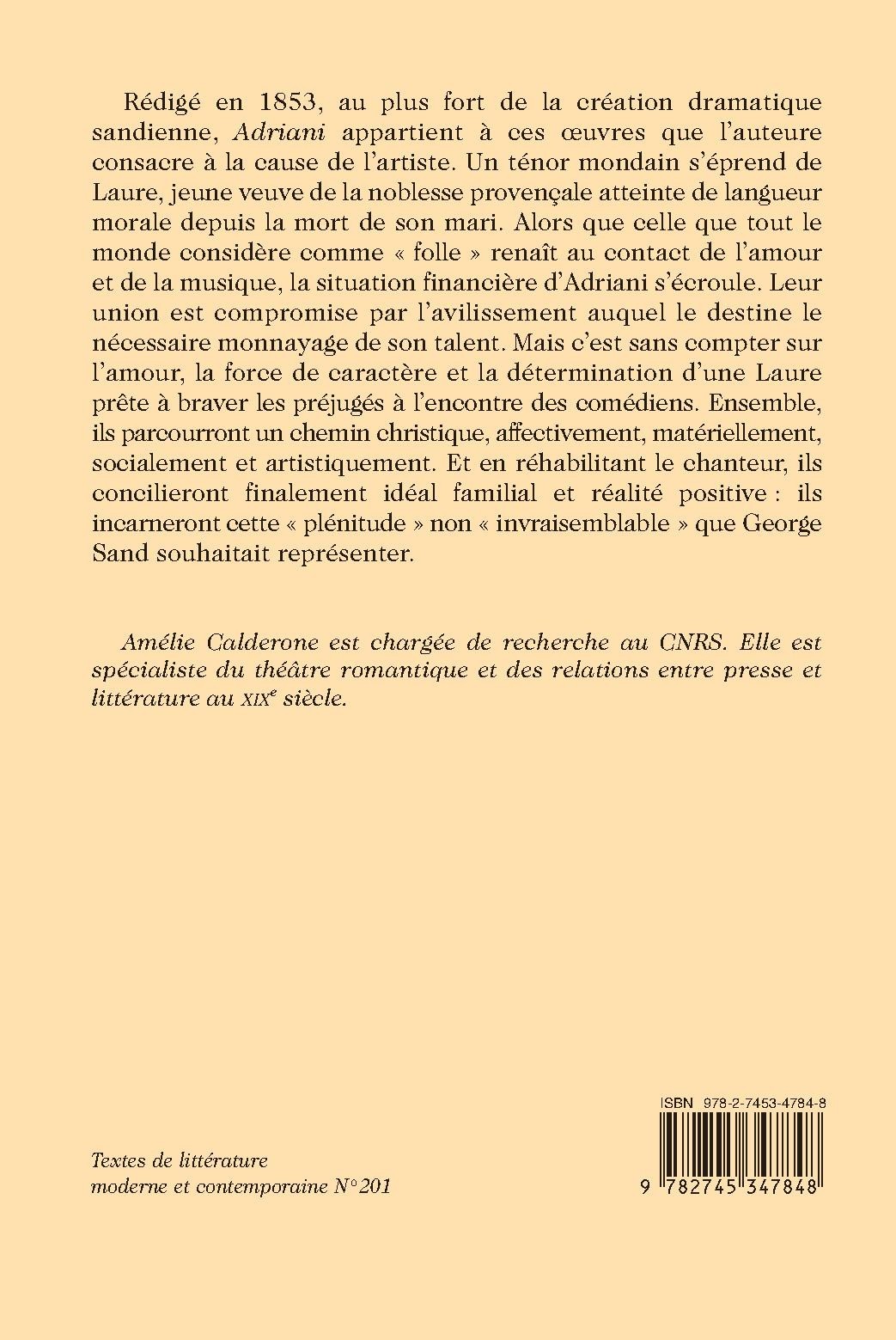 Rédigé en 1853, au plus fort de la création dramatique sandienne, Adriani appartient à ces œuvres que l’auteure consacre à la cause de l’artiste. Un ténor mondain s’éprend de Laure, jeune veuve de la noblesse provençale atteinte de langueur morale depuis la mort de son mari. Alors que celle que tout le monde considère comme « folle » renaît au contact de l’amour et de la musique, la situation financière d’Adriani s’écroule. Leur union est compromise par l’avilissement auquel le destine le nécessaire monnayage de son talent. Mais c’est sans compter sur l’amour, la force de caractère et la détermination d’une Laure prête à braver les préjugés à l’encontre des comédiens. Ensemble, ils parcourront un chemin christique, affectivement, matériellement, socialement et artistiquement. Et en réhabilitant le chanteur, ils concilieront finalement idéal familial et réalité positive : ils incarneront cette « plénitude » non « invraisemblable » que George Sand souhaitait représenter.