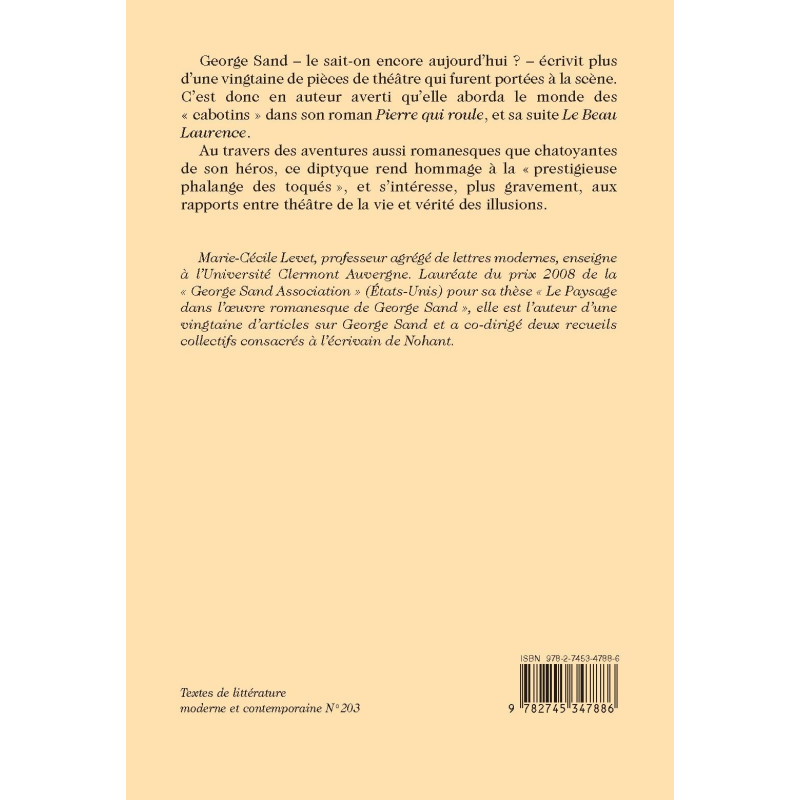 George Sand – le sait-on encore aujourd’hui ? – écrivit plus d’une vingtaine de pièces de théâtre qui furent portées à la scène. C’est donc en auteur averti qu’elle aborda le monde des « cabotins » dans son roman Pierre qui roule, et sa suite Le Beau Laurence. Au travers des aventures aussi romanesques que chatoyantes de son héros, ce diptyque rend hommage à la « prestigieuse phalange des toqués », et s’intéresse, plus gravement, aux rapports entre théâtre de la vie et vérité des illusions.