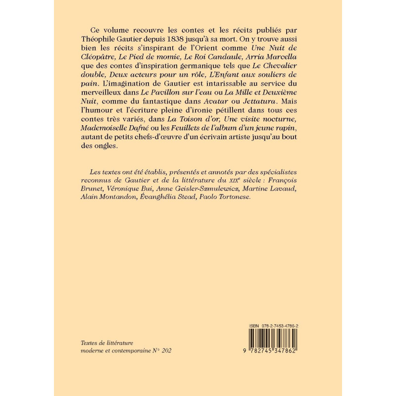 Ce volume recouvre les contes et les récits publiés par Théophile Gautier depuis 1838 jusqu’à sa mort. On y trouve aussi bien les récits s’inspirant de l’Orient comme Une Nuit de Cléopâtre, Le Pied de momie, Le Roi Candaule, Arria Marcella que des contes d’inspiration germanique tels que Le Chevalier double, Deux acteurs pour un rôle, L’Enfant aux souliers de pain. L’imagination de Gautier est intarissable au service du merveilleux dans Le Pavillon sur l’eau ou La Mille et Deuxième Nuit, comme du fantastique dans Avatar ou Jettatura. Mais l’humour et l’écriture pleine d’ironie pétillent dans tous ces contes très variés, dans La Toison d’or, Une visite nocturne, Mademoiselle Dafné ou les Feuillets de l’album d’un jeune rapin, autant de petits chefs-d'œuvre d’un écrivain artiste jusqu’au bout des ongles.