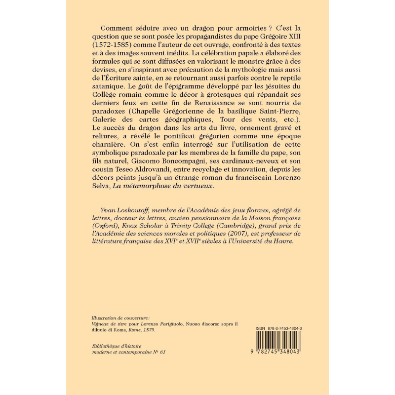 Comment séduire avec un dragon pour armoiries ? C’est la question que se sont posée les propagandistes du pape Grégoire XIII (1572-1585) comme l’auteur de cet ouvrage, confronté à des textes et à des images souvent inédits. La célébration papale a élaboré des formules qui se sont diffusées en valorisant le monstre grâce à des devises, en s’inspirant avec précaution de la mythologie mais aussi de l’Écriture sainte, en se retournant aussi parfois contre le reptile satanique. Le goût de l’épigramme développé par les jésuites du Collège romain comme le décor à grotesques qui répandait ses derniers feux en cette fin de Renaissance se sont nourris de paradoxes (Chapelle Grégorienne de la basilique Saint-Pierre, Galerie des cartes géographiques, Tour des vents, etc.). Le succès du dragon dans les arts du livre, ornement gravé et reliures, a révélé le pontificat grégorien comme une époque charnière. On s’est enfin interrogé sur l’utilisation de cette symbolique paradoxale par les membres de la famille du pape, son fils naturel, Giacomo Boncompagni, ses cardinaux-neveux et son cousin Teseo Aldrovandi, entre recyclage et innovation, depuis les décors peints jusqu’à un étrange roman du franciscain Lorenzo Selva, La métamorphose du vertueux.
